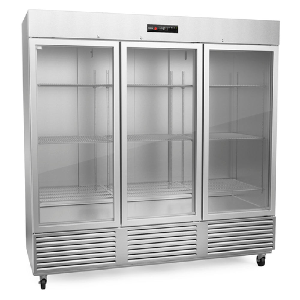 The Fagor Refrigeration QVR-3G-N 19056619 QV Series Refrigerator is a reach-in, three-section unit boasting a spacious 76 cu.ft. capacity, ideal for commercial settings requiring substantial cold storage. This refrigerator features a digital controller and display thermometer, facilitating precise temperature management crucial for maintaining perishable goods. Enhanced with an interior incandescent light and a door alarm, it ensures both visibility and security of stored items. The unit is equipped with nine adjustable wire shelves, providing flexible storage options for various sized items, and is built with a robust stainless steel interior and exterior for durability and ease of cleaning. Its standard depth accommodates 18" x 26" bun trays, making it suitable for professional kitchens and bakeries. The three dual-pane glass doors enhance energy efficiency and allow clear visibility of contents. For mobility, the refrigerator is fitted with 4" castors, with the front two including brakes for stability. The bottom-mount self-contained refrigeration system is powered by a 3/4 hp motor, ensuring reliable performance. Certified by cETL, UL, and NSF 7, the Fagor QVR-3G-N is a high-quality, North American-made product, tailored to meet the highest standards in food safety and operational efficiency across various industry segments.