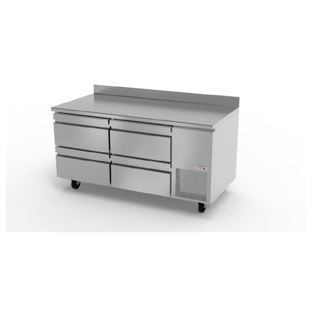 The Fagor Refrigeration SWR-67-D4 19095863 Worktop Refrigerator is a versatile and highly functional unit designed to meet the diverse needs of commercial kitchens. Featuring a substantial 67-1/4" width and a generous 18.6 cu.ft. capacity, this refrigerator accommodates four drawers, each capable of holding two 12" x 20" x 6" deep pans, although pans are not included. The refrigerator boasts a side-mount compressor and a front-breathing self-contained refrigeration system, ensuring efficient cooling performance. For ease of mobility and stability, it is fitted with 5" casters, with the front two equipped with brakes. The robust construction is evident in its stainless steel exterior and interior finish, providing durability and a sleek, professional look. A 4" coved fixed backsplash enhances the unit's practicality by preventing food and liquids from falling behind the refrigerator. Powered by a 1/4 hp motor, it is cETL, UL, and NSF 7 certified, attesting to its adherence to stringent safety and sanitation standards. Manufactured in North America, this worktop refrigerator is an ideal choice for various market segments within the foodservice industry, offering reliable performance and high-quality construction to optimize kitchen workflows.