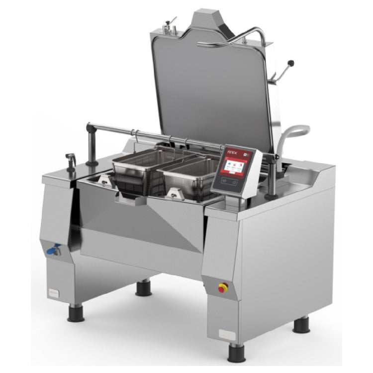 The Firex UDBRG048ACV1 Betterpan Tilting Skillet Pressure Braising Pan Gas is a versatile and innovative kitchen appliance designed for large-scale cooking operations. This powerful skillet boasts a 48-gallon capacity, making it ideal for high-volume cooking environments such as commercial kitchens and catering establishments. Featuring programmable electronic controls with a 7-inch touch screen, it offers precise cooking adjustments to meet diverse culinary needs. The auto-fill function ensures consistent water levels, enhancing efficiency and productivity. Safety and convenience are prioritized with a spring-balanced hinged lid equipped with a reinforced locking system, and an automatic lifting system simplifies operation. A core temperature probe fixed at the lid allows for accurate monitoring of cooking temperatures. Connectivity is enhanced with a USB connection for seamless data transfer, and the unit stands on adjustable feet for stability. Constructed from durable stainless steel, it delivers robust performance with a power output of 143,300 BTU and operates at 5.8 PSI. The Firex UDBRG048ACV1 is certified IPX4 for water resistance and meets cETLus and ETL-Sanitation standards, ensuring reliability and compliance with industry safety regulations. This skillet is an exceptional choice for professional chefs seeking a reliable and efficient pressure braising solution.