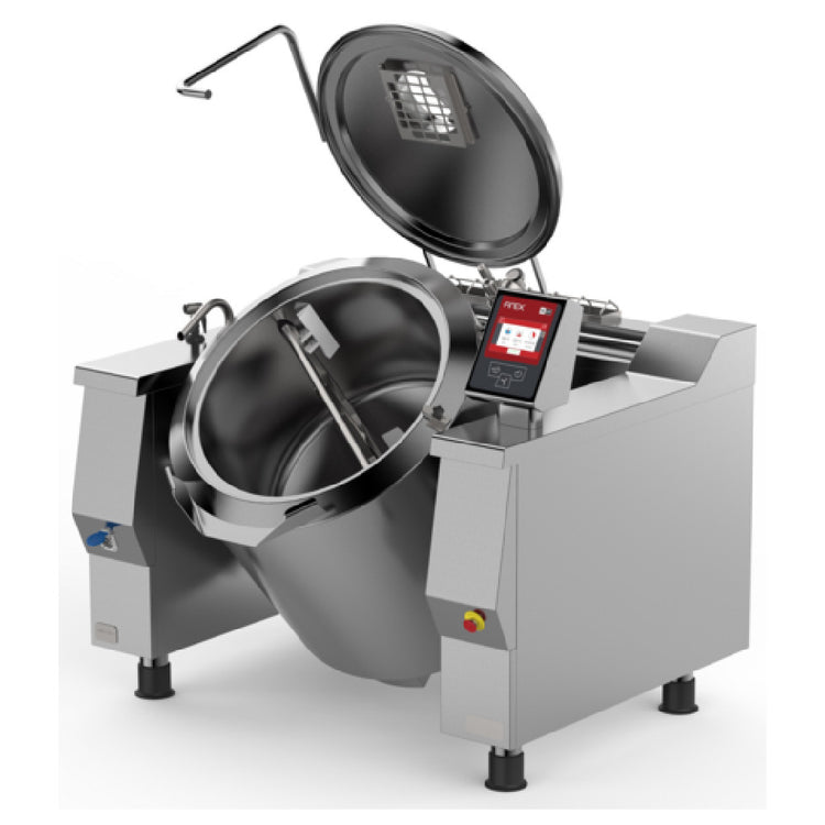 Firex UPRIE122M_V1 Tilting Kettle With Mixer Electric Indirect Heating - This advanced tilting kettle features a generous 122-gallon capacity, perfect for large-scale cooking operations. It operates on electric indirect heating, ensuring efficient and even heat distribution. The insulated lid comes with a double cover to maintain optimal cooking temperatures. Incorporating a two-arm mixing system with four removable POM scrapers, this kettle is designed for versatility and ease of use. Equipped with five distinct cooking modes and a cooling double-jacket, it offers precise temperature control through two dedicated probes. The multifunctional keyboard with a touch screen interface streamlines operation, while the pressure is meticulously managed by a pressure switch at 8.7 PSI and a safety valve at 12.3 PSI. Additional safety is provided by a vacuum valve and an analog pressure gauge, alongside an emergency button for quick shutdown. Constructed from high-quality 316 stainless steel for the inner liner and 304 stainless steel for the outer body, it stands on four adjustable stainless steel feet. The unit is IPX5 rated and ETL certified, highlighting its durability and adherence to industry standards. This kettle is particularly suited for commercial kitchens and industrial food processing environments seeking reliability and efficiency.