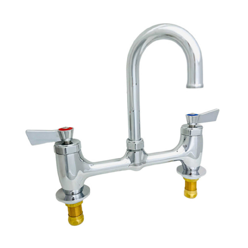 The Fisher 18210 Faucet Deck Mount 8" Centers is a versatile and robust fixture designed for diverse commercial and industrial applications. Engineered with precision, this faucet features 8-inch centers, ensuring a stable and reliable installation. The inclusion of a 6-inch swivel gooseneck spout provides flexibility and ease of use, catering to a range of operational needs. Lever handles equipped with color-coded indexes offer intuitive control and enhance user experience, making it accessible for all. The faucet's 1/2-inch NPT male inlets allow for seamless integration with existing plumbing systems, ensuring compatibility and ease of installation. Constructed from high-quality brass, the Fisher 18210 ensures durability and long-lasting performance, standing up to the demands of various environments. Additionally, this faucet is ADA compliant, highlighting its commitment to accessibility and user safety. This product is ideal for those seeking a reliable, efficient, and compliant faucet solution within the commercial plumbing industry, providing exceptional value through its thoughtful design and robust features.