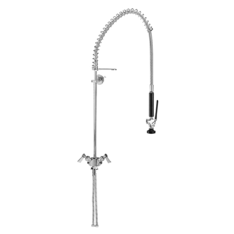 The Fisher 21100 Pre-Rinse Assembly Single-deck Dual Control Valve with Spring Action Flexible Gooseneck is a versatile and efficient solution for commercial kitchens, emphasizing durability and precision. It features a single-deck dual control valve, allowing for seamless operation and control over water flow. The assembly is designed with a spring action flexible gooseneck, offering ease of maneuverability and adaptability in various kitchen spaces. It includes a 21-inch riser and a 36-inch hose, providing ample reach and flexibility for diverse cleaning tasks. Enhanced by a wall bracket for secure installation, this pre-rinse assembly ensures stability during use. The Ultra-Spray-PLUS spray valve delivers a water flow rate of 1.15 gallons per minute at 60 PSI, optimizing water usage while maintaining effective cleaning performance. Engineered for high-demand environments, the Fisher 21100 is an ideal choice for restaurant kitchens, catering services, and any food service operation requiring reliable pre-rinse functionality. Its robust construction and thoughtful design make it a dependable asset, tailored to meet the needs of professionals seeking resilience and efficiency in their equipment.
