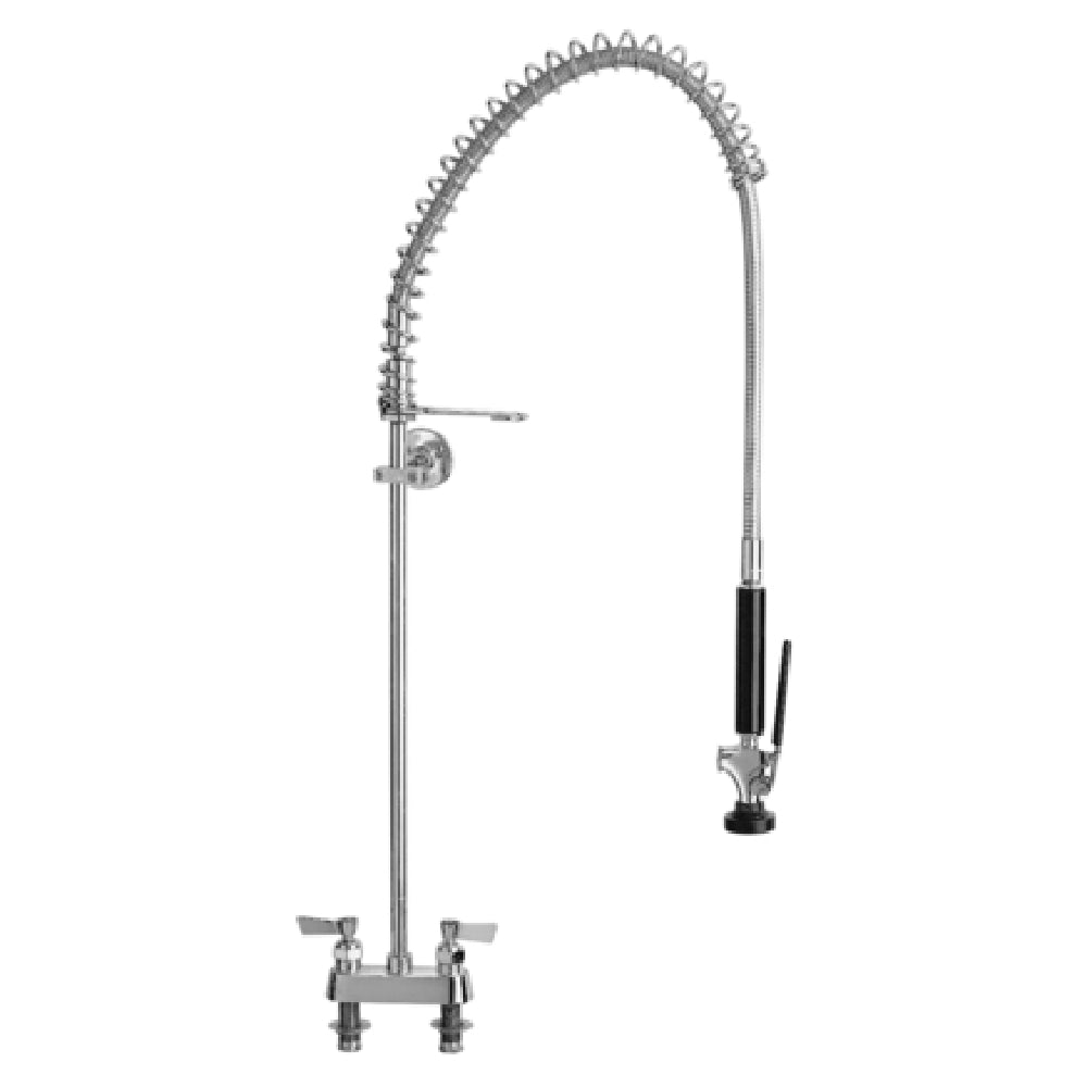 The Fisher 25100 Pre-Rinse Assembly is a specialized kitchen fixture that combines functionality with precision engineering. This assembly features a 4-inch deck-mounted control valve, providing an easy-to-use interface for regulating water flow. A standout feature is its spring-action flexible gooseneck, which enhances maneuverability and reach, making it suitable for a variety of cleaning tasks in both commercial and industrial kitchens. The unit includes a 21-inch riser and a 36-inch hose, allowing for extended reach and flexibility. An additional wall bracket ensures stability and ease of installation, particularly in high-demand environments. The assembly's Ultra-Spray™/PLUS spray valve operates at a rate of 1.15 gallons per minute at 60 PSI, offering both efficiency and performance. The Fisher 25100 is designed to meet the rigorous demands of restaurant kitchens, food service operations, and any facility requiring reliable pre-rinse solutions. Its robust build and thoughtful design elements make it a valuable addition to any professional setting, delivering versatility and durability. Perfect for establishments prioritizing high-efficiency systems, this assembly ensures that every pre-rinse task is handled with precision and care. The Fisher 25100 stands out as an essential component for efficient kitchen operations, catering to diverse industry needs.