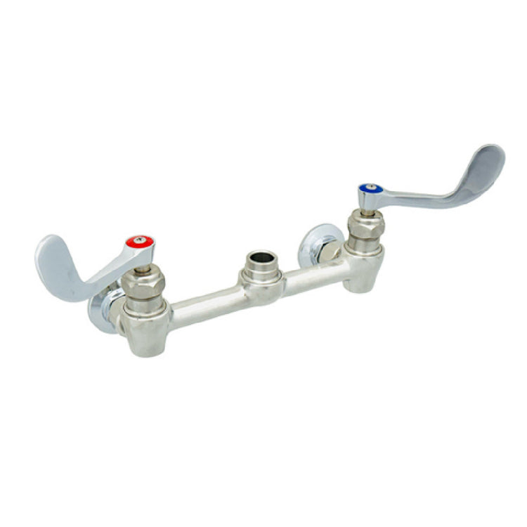 The Fisher 61557 Control Valve - backsplash mount, 8" centers is a high-performance plumbing fixture engineered for diverse industrial applications. This control valve is designed with swivel outlets and swivel stems, ensuring versatility and ease of use in various settings. It features wrist handles equipped with color-coded indexes, which enhance user interaction by providing clear visual guidance for operation. The valve is constructed from durable stainless steel, offering robust longevity and corrosion resistance, essential for demanding environments. With 1/2" NPT male inlets, it ensures compatibility with standard piping systems, simplifying installation and maintenance. The ADA compliance of the Fisher 61557 underscores its commitment to accessibility, making it a reliable choice for facilities that prioritize inclusive design. Notably, this valve does not include a spout, catering to specific use cases where such a feature is unnecessary. Its strategic design makes it suitable for various industry sectors, including healthcare, hospitality, and commercial kitchens, where precision and reliability are paramount. This control valve exemplifies a blend of functional engineering and thoughtful design, tailored to meet the needs of professionals seeking dependable and efficient valve solutions.