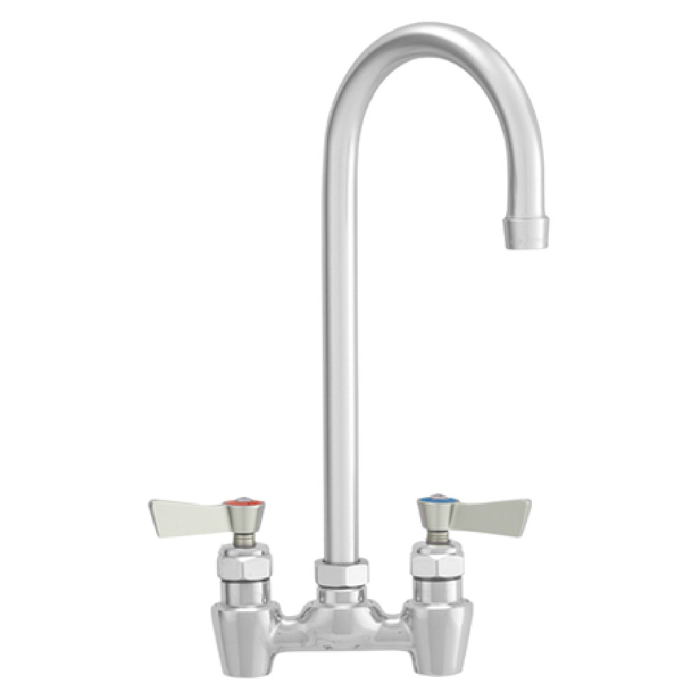 The Fisher 62669 Faucet backsplash mount with 4" centers is a precision-engineered fixture designed for versatile applications in professional settings. This faucet is equipped with a 6" swivel/rigid gooseneck spout, which can be converted to a fixed position using the included star washer, offering adaptability to suit various user needs. The faucet features lever handles with color-coded indexes, ensuring ease of use and accessibility for all, aligning with ADA compliance standards. Constructed from durable stainless steel, the Fisher 62669 is built to withstand the rigors of daily use while maintaining a sleek and professional appearance. The installation is facilitated by 1/2" NPT male inlets, providing a secure and reliable connection to existing plumbing systems. This product's robust design and compliance with industry standards make it an ideal choice for sectors ranging from healthcare facilities to commercial kitchens, where reliability and performance are paramount. Its thoughtful design not only enhances functionality but also promotes an inclusive environment, making it a valuable addition to any establishment requiring a high-quality, adaptable faucet solution.