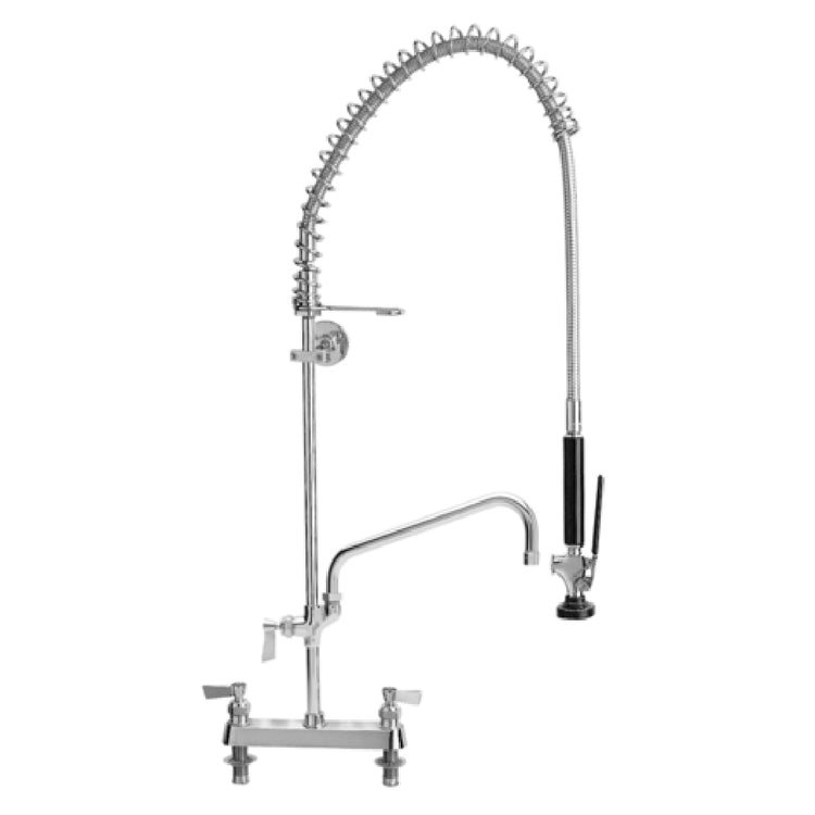 The Fisher 68268 Pre-Rinse Unit is a high-performance kitchen fixture designed for efficiency and durability, featuring a robust spring mechanism and an 8-inch deck mount configuration. This unit is tailored for commercial kitchens seeking reliable pre-rinse capabilities, integrating an Add-On-Faucet with a 12-inch swing spout crafted from premium stainless steel. The design ensures flexibility and robust water flow, making it ideal for various washing and rinsing needs while maintaining a sleek aesthetic. The stainless steel construction offers resistance against corrosion and daily wear, ensuring longevity even in the most demanding environments. This pre-rinse unit is engineered to provide exceptional performance across different market segments within the food service industry, whether it's in a bustling restaurant kitchen, a catering facility, or an institutional dining setting. By facilitating efficient pre-rinse operations, it optimizes workflow and reduces water consumption, making it a sustainable choice for environmentally conscious businesses. The thoughtful design and construction of the Fisher 68268 Pre-Rinse Unit ensure that it meets the rigorous standards of professional kitchens, combining functionality with form to deliver a superior user experience.