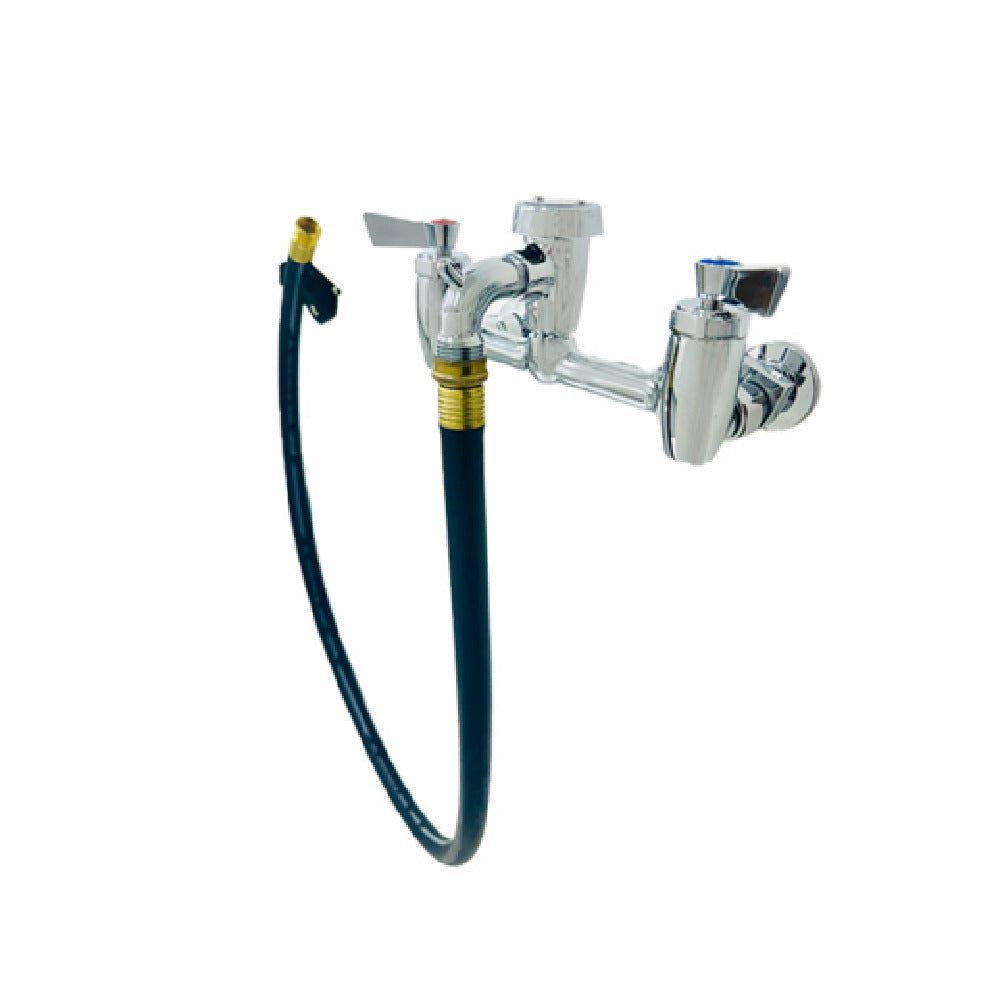 Fisher, 76140, Service Sink Faucet, wall mounted mixing faucet with 8” adjustable centers, 3” garden spout with garden hose outlet, lever handles, 1/2” inlets, hose and holder