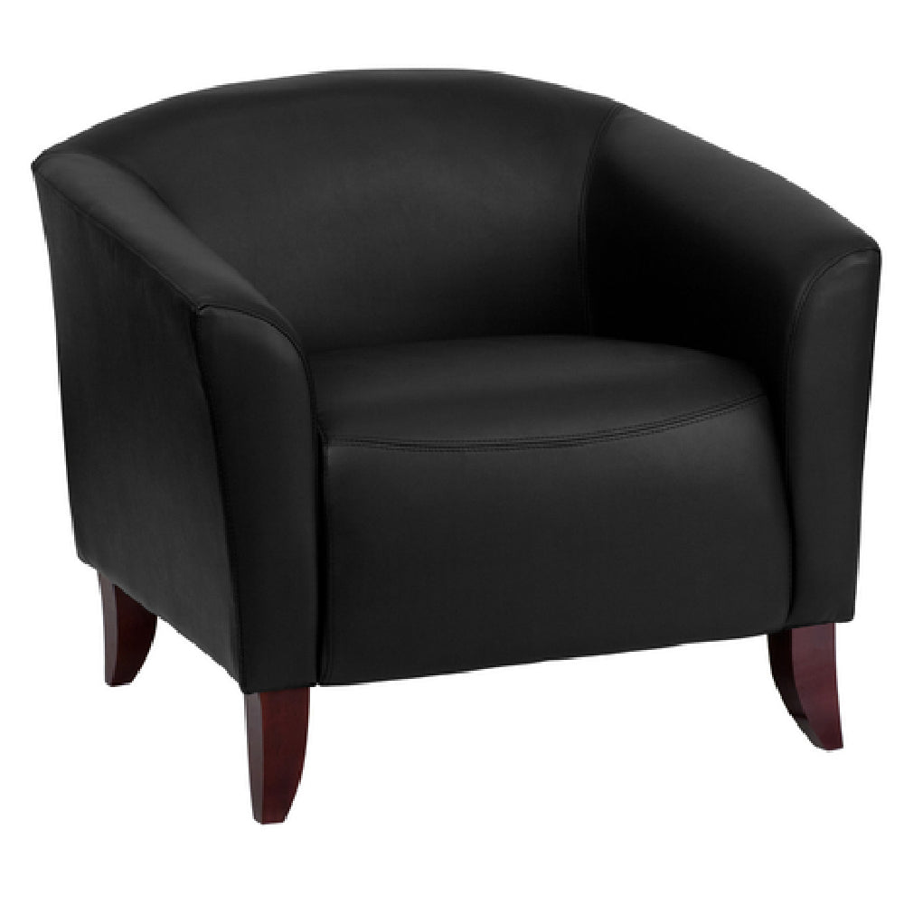 Flash Furniture 111-1-BK-GG Hercules Imperial Series Reception Chair is a sophisticated seating solution designed for modern reception areas and professional environments. This chair is upholstered with LeatherSoft, a premium blend of leather and polyurethane, providing enhanced softness and durability. The design features sloping arms along with a slightly curved seat and back, offering ergonomic comfort for users. A fixed seat cushion is crafted from 1.8 high-density CA117 fire retardant foam, ensuring safety and long-lasting firmness. The chair is built with sturdy hardwood construction, providing robust support and durability over time. Cherry-stained wood feet add a touch of elegance to its design, making it a versatile addition to various interior decor styles. Available in classic black, this reception chair requires assembly and is typically shipped within 24 hours for in-stock items. The Hercules Imperial Series Reception Chair is an excellent choice for businesses seeking to enhance their reception areas with furniture that combines style, comfort, and safety standards.