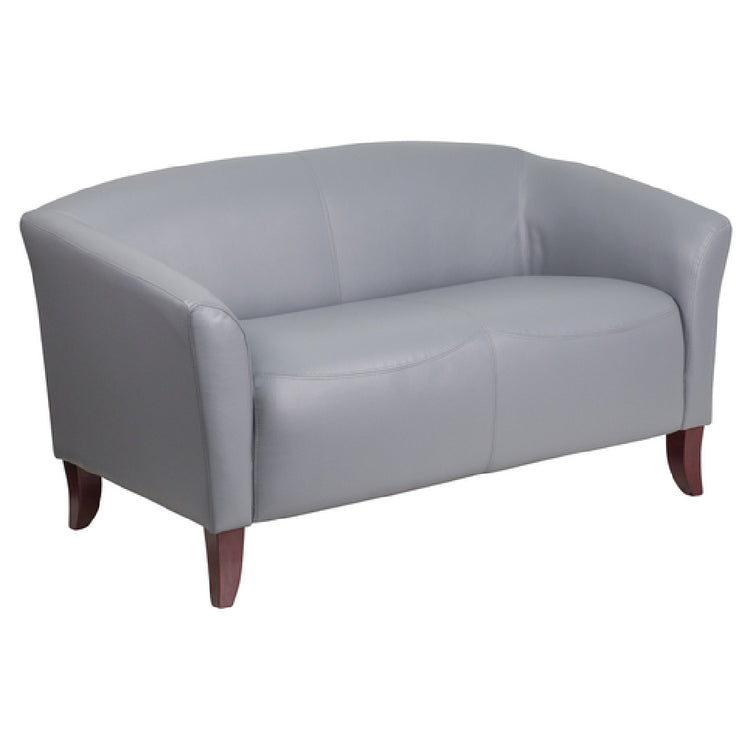 The Flash Furniture 111-2-GY-GG Hercules Imperial Series Reception Loveseat is a meticulously designed seating solution measuring 52"W x 29"D x 29"H, ideal for various commercial and office reception areas. This loveseat features LeatherSoft upholstery which combines leather and polyurethane for added softness and durability, enhancing the seating experience while ensuring longevity. Its sloping arms and slightly curved seat and back provide ergonomic support, promoting comfort during extended use. The loveseat includes a fixed seat cushion filled with 1.8 high density CA117 fire retardant foam, ensuring safety and resilience. Sturdy hardwood construction underpins this piece, complemented by cherry stained wood feet, providing an elegant yet robust base. Available in a sophisticated gray hue, this loveseat requires assembly upon delivery. The product's design and materials make it suitable for a range of environments, from corporate offices to hospitality settings, where both aesthetics and function are paramount. Efficient shipping processes ensure that in-stock items typically ship within 24 hours, allowing for quick deployment in necessary spaces. The combination of quality materials and thoughtful design makes the Flash Furniture 111-2-GY-GG an appealing choice for those seeking reliable and stylish furniture solutions in professional settings.