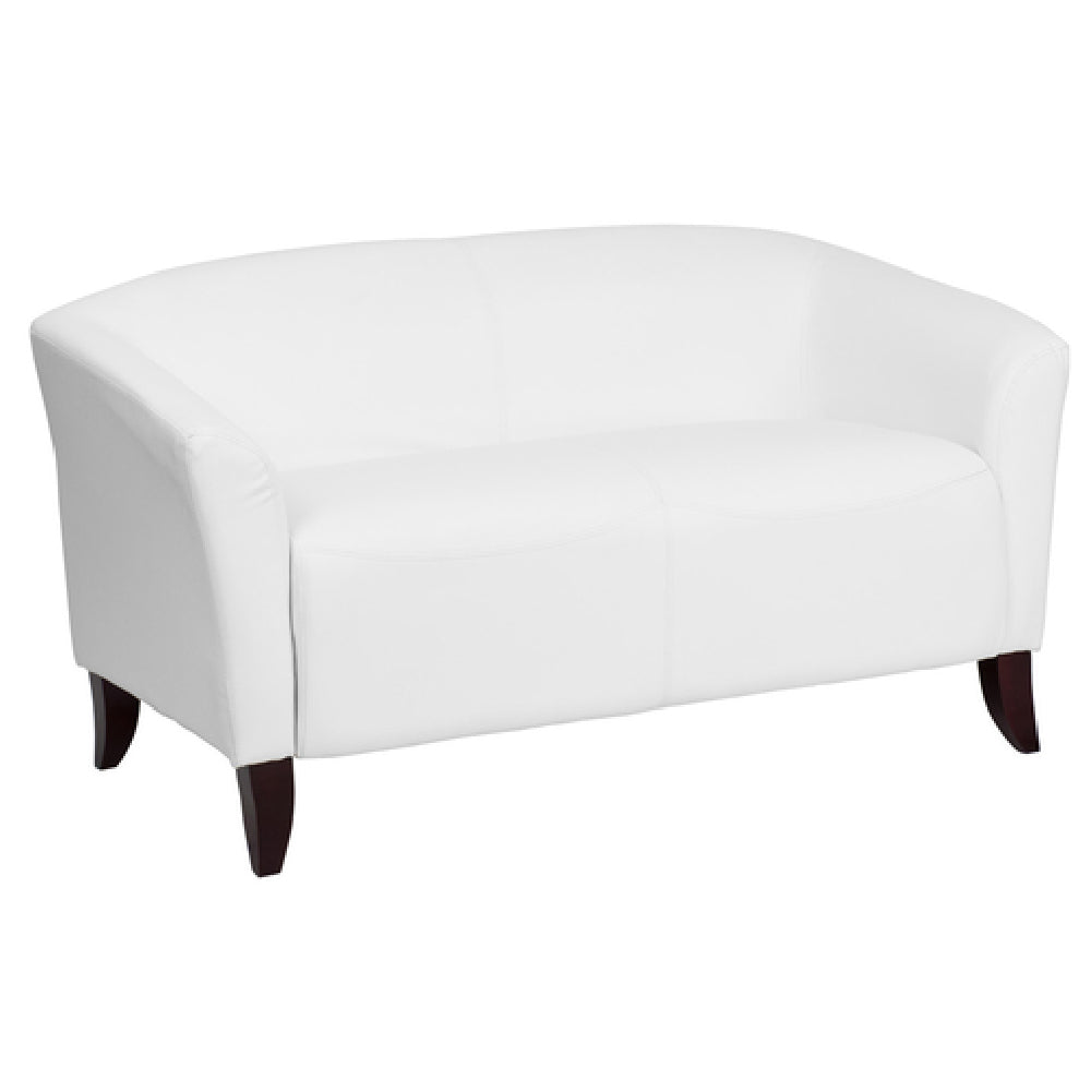 The Flash Furniture 111-2-WH-GG Hercules Imperial Series Reception Loveseat is a distinguished piece measuring 52"W x 29"D x 29"H, tailored for both style and durability in various professional settings. It features LeatherSoft upholstery, a blend of leather and polyurethane, ensuring softness and longevity. The loveseat is designed with sloping arms and a slightly curved seat and back, providing both comfort and a modern aesthetic. Its fixed seat cushion is constructed with 1.8 high-density CA117 fire retardant foam, enhancing safety and resilience. The robust frame, built from sturdy hardwood, ensures long-term use, while the cherry-stained wood feet add a touch of elegance. This loveseat is available in a classic white finish, making it an ideal addition to contemporary reception areas, executive offices, or upscale waiting rooms. Assembly is required, and in-stock items typically ship within 24 hours, ensuring quick delivery for urgent furnishing needs. This combination of technical design and aesthetic appeal positions the Hercules Imperial Series Loveseat as a versatile choice for businesses aiming to balance function with sophisticated design.