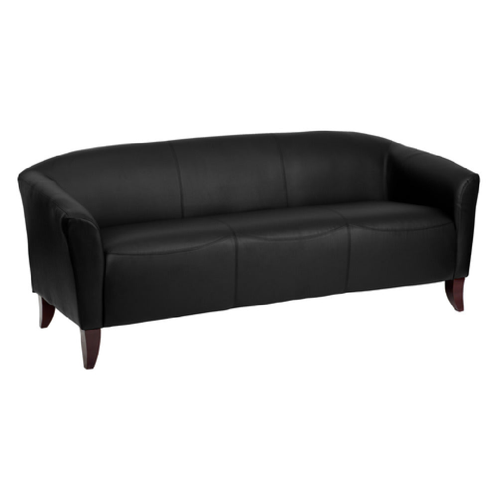 The Flash Furniture 111-3-BK-GG Hercules Imperial Series Reception Sofa - 72-3/4"W x 29"D x 29"H, is an elegant seating solution designed for both style and durability, making it suitable for diverse segments such as corporate offices, hospitality venues, and modern residential settings. Featuring LeatherSoft upholstery, this sofa combines the supple feel of leather with the robust durability of polyurethane, ensuring both comfort and long-lasting wear. The design includes sloping arms and a slightly curved seat and back, providing ergonomic support and aesthetic appeal. The fixed seat cushion is made from 1.8 high-density CA117 fire retardant foam, offering safety and comfort in high-traffic areas. The sofa's sturdy hardwood construction is complemented by cherry-stained wood feet, adding a touch of sophistication to its appearance. Available in a classic black finish, this reception sofa requires assembly but promises ease with its straightforward design. In-stock items typically ship within 24 hours, ensuring prompt delivery for immediate furnishing needs. The Flash Furniture Hercules Imperial Series Reception Sofa stands out in its category for its blend of comfort, safety, and timeless design, making it an ideal choice for environments that require both function and style.
