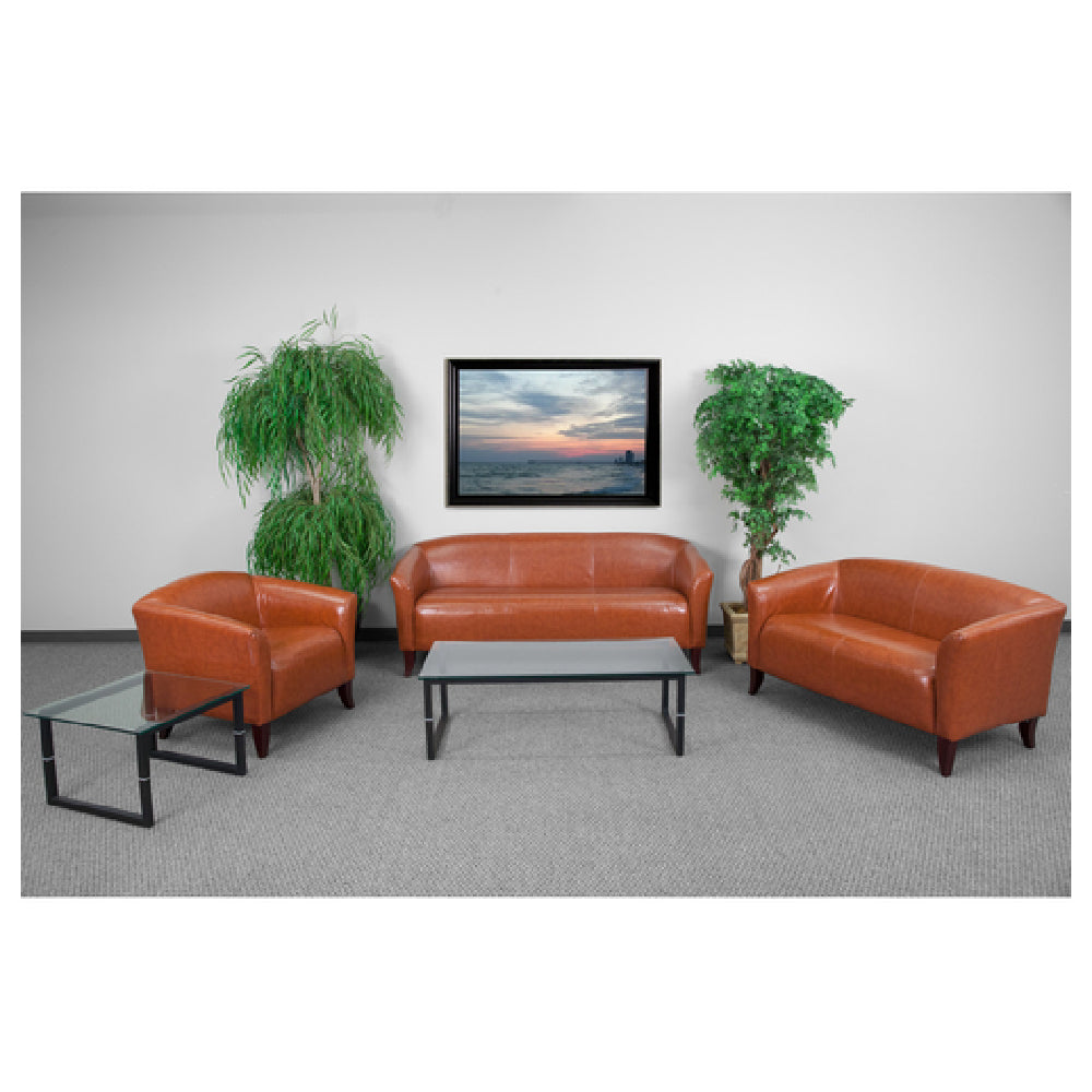 The Flash Furniture 111-SET-CG-GG Hercules Imperial Series Reception Set is a meticulously crafted collection designed to enhance reception areas with elegance and functionality. This set comprises a 33-1/2"W x 31"D x 29"H chair, a 52"W x 29"D x 29"H loveseat, and a 72-3/4"W x 29"D x 29"H sofa, each exhibiting LeatherSoft upholstery for a touch of sophistication and easy maintenance. The set is distinguished by its sloping arms and slightly curved seat and back, offering both style and comfort. The fixed seat cushion is filled with 1.8 high-density CA117 fire retardant foam, ensuring lasting resilience and safety. Constructed with sturdy hardwood and cherry-stained wood feet, this set promises durability and a refined aesthetic. The cognac finish adds a classic appeal, seamlessly fitting into various professional environments. Assembly is required, and the set ships in three boxes, with in-stock items typically dispatched within 24 hours. The Hercules Imperial Series Reception Set is an ideal choice for diverse segments, including corporate offices, hospitality venues, and medical waiting areas, where sophistication and comfort are paramount.