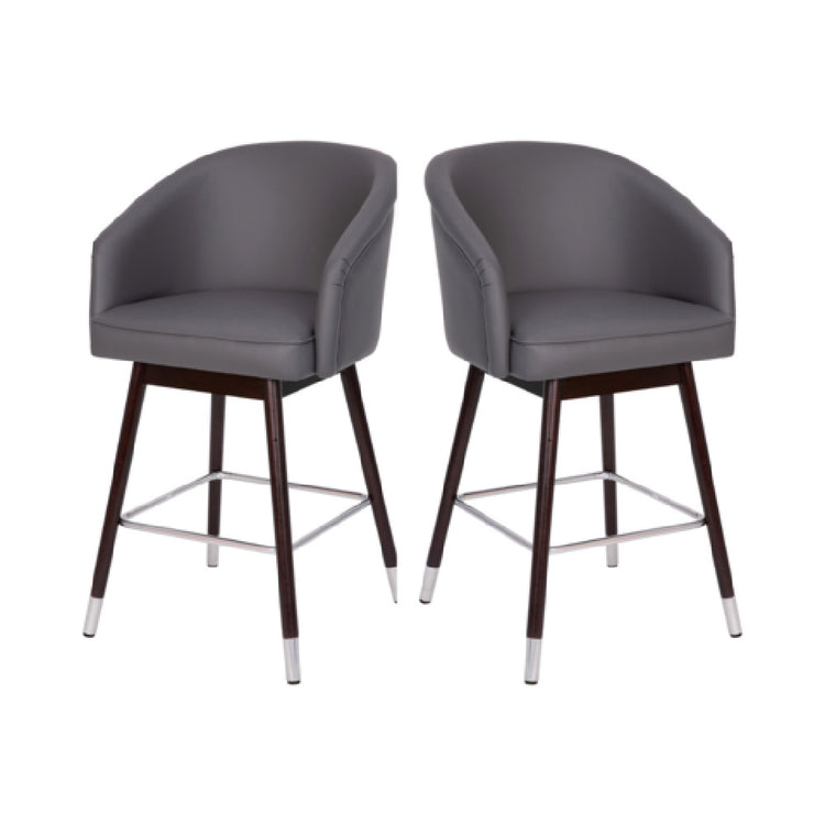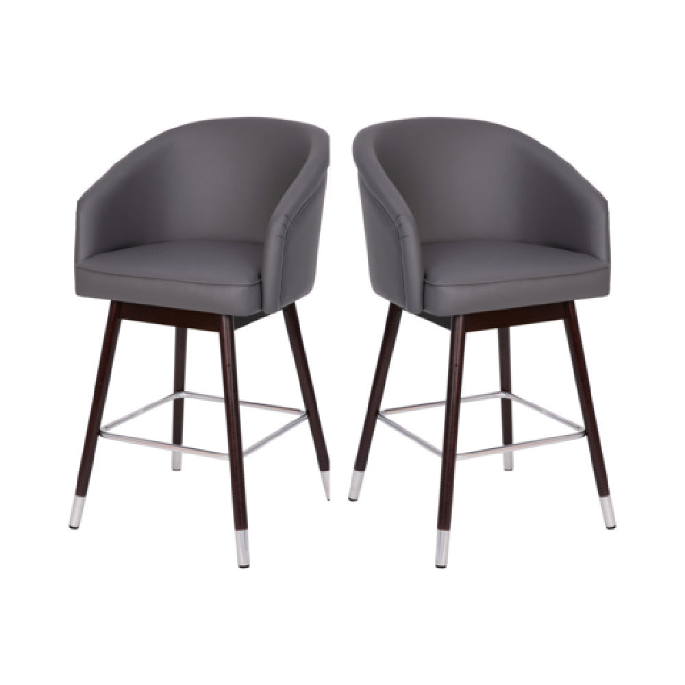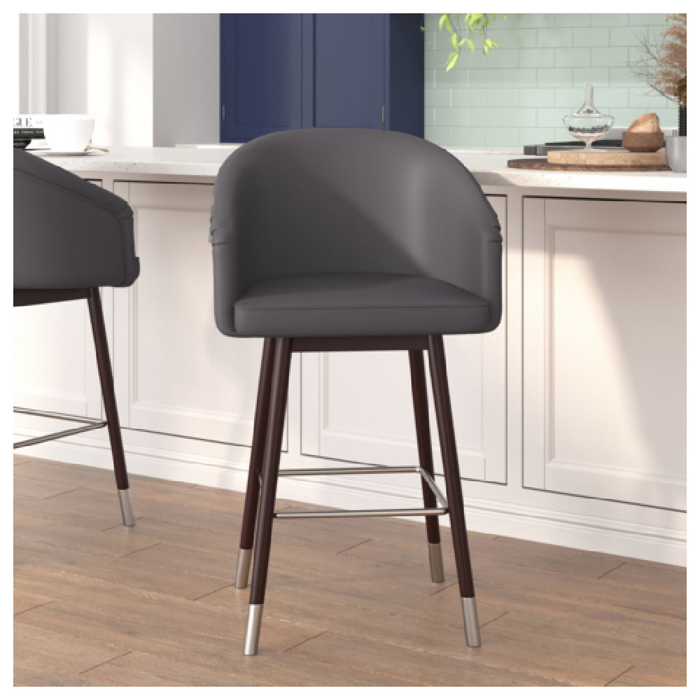 The Flash Furniture 2-AY-1928-26-GY-GG Margo Counter Stool Mid-back 26" Seat Height is a sophisticated seating option designed for a variety of environments, from home kitchens to upscale dining establishments. Featuring a gray leather back and seat, this stool provides a comfortable and stylish seating experience. The contoured back of the Margo Counter Stool ensures ergonomic support, enhancing comfort during extended use. It stands 26 inches high, making it a perfect fit for counter-height surfaces. The walnut finish beechwood legs add a touch of elegance and durability, while the bronze accents offer a modern aesthetic appeal. Sold as a set of two, this product provides excellent value for those looking to furnish a space with a cohesive look. With in-stock items typically shipping within 24 hours, the Flash Furniture 2-AY-1928-26-GY-GG Margo Counter Stool is a convenient choice for those needing prompt delivery. This stool's combination of functional design and quality materials makes it a versatile piece suitable for residential and commercial settings alike, satisfying diverse market segments within the furniture industry.