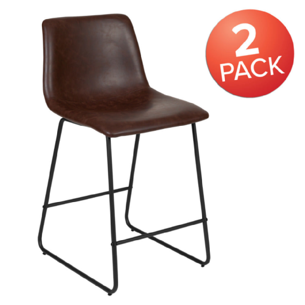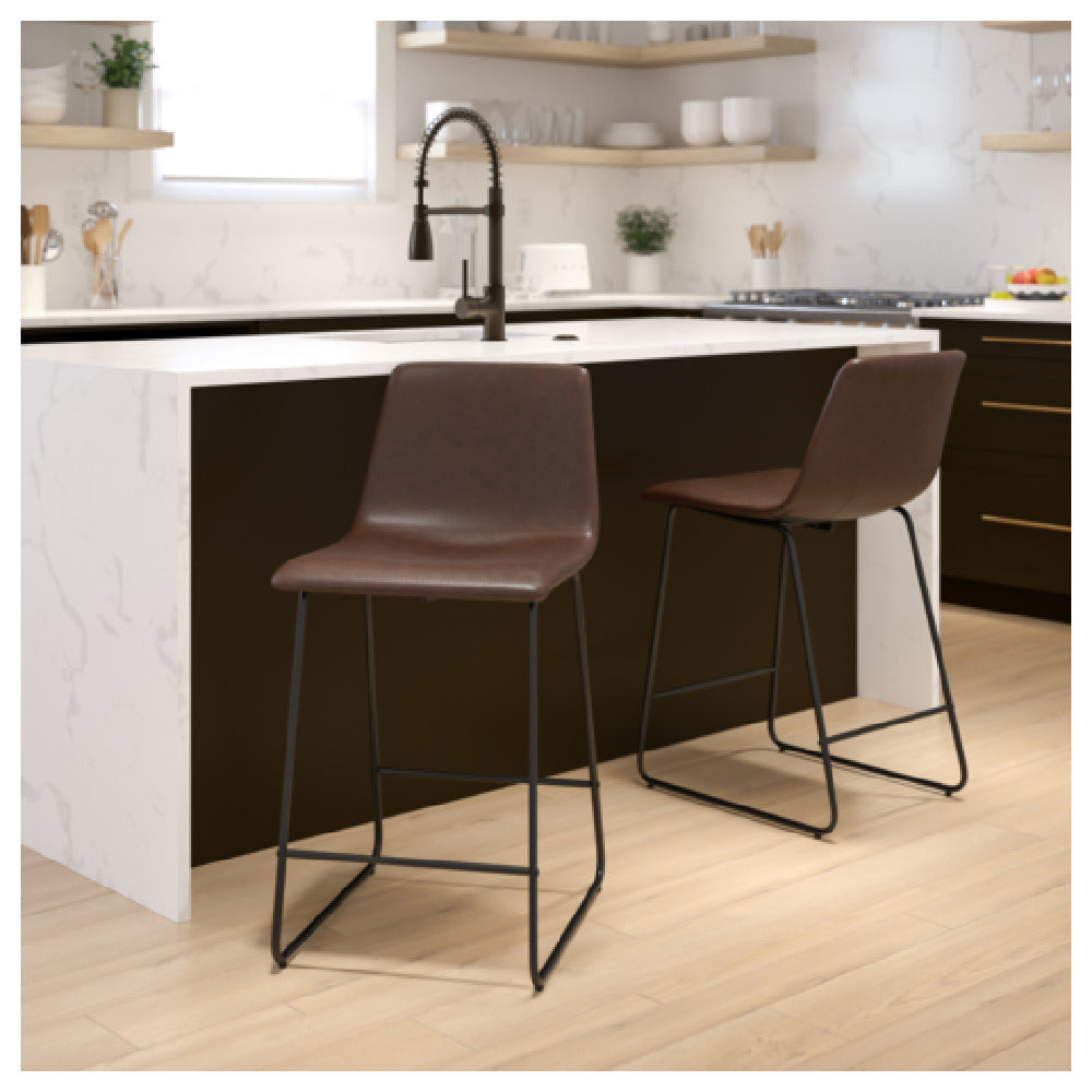 The Flash Furniture 2-ET-ER18345-24-DB-GG Reagan Bar Stool is a meticulously engineered seating option designed for durability and style, accommodating a weight capacity of up to 300 lbs. This bar stool measures 18 inches in width, 22 inches in depth, and stands at a height of 35-1/2 inches, making it ideal for counter-height settings. It features a LeatherSoft seat and back, providing a harmonious blend of comfort and elegance. LeatherSoft, known for its blend of leather and polyurethane, enhances the stool’s softness and longevity. Presented in a dark brown finish, this set of two stools seamlessly integrates with various interior decors, offering a sophisticated touch to both residential and commercial spaces. The Reagan Bar Stool’s robust construction and timeless design cater to diverse market segments, from upscale home kitchens to bustling restaurant environments. With its superior weight capacity and plush seating, this bar stool represents a valuable addition for those seeking reliable and aesthetically pleasing furniture solutions.