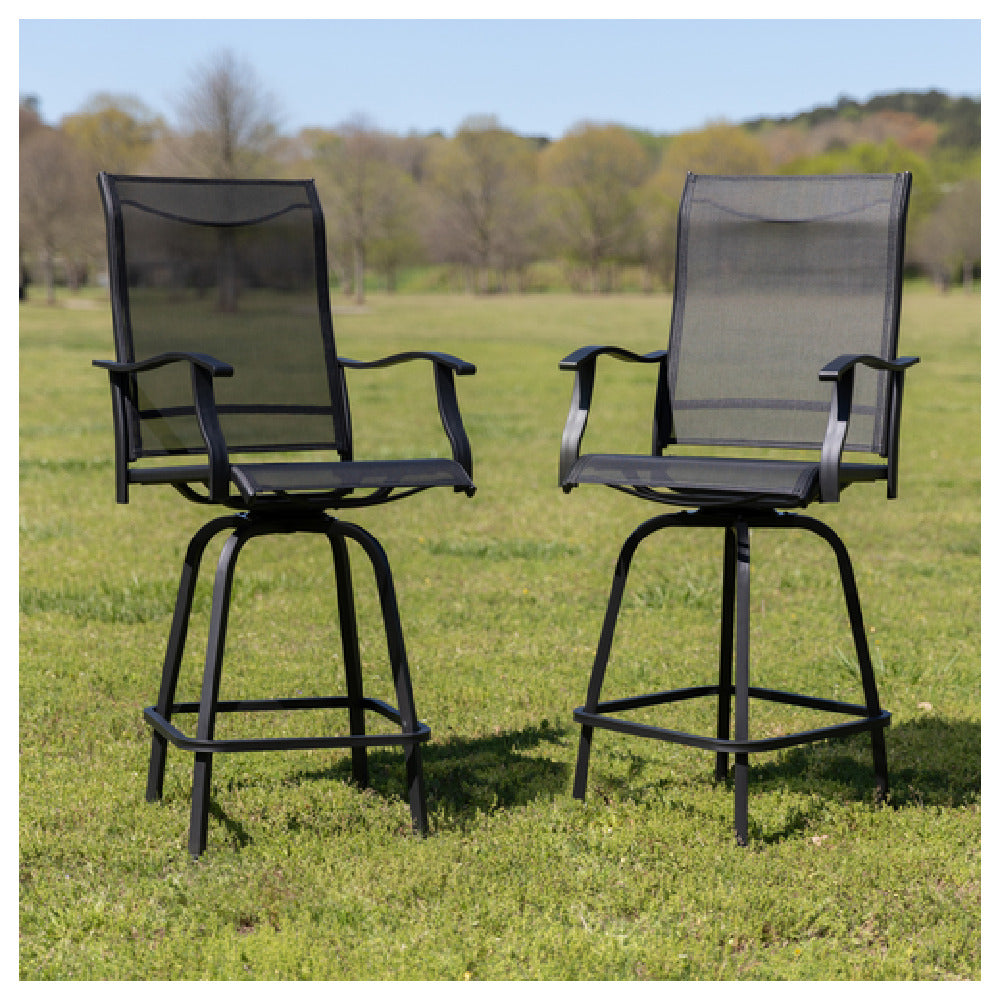 The Flash Furniture 2-ET-SWVLPTO-30-BK-GG Patio Swivel Stool is a versatile seating solution designed for outdoor use, combining functionality with sleek design elements. It features a robust 300 lb. weight capacity, making it suitable for a variety of users and environments. This bar-height stool is constructed with a black galvanized steel frame, ensuring durability and resistance to outdoor elements. The seating is enhanced by a transparent mesh full back and a waterfall seat design, both crafted in black textilene sling fabric, which offers comfort and style. Its curved scroll arms provide additional support and an elegant touch. The stool's swivel functionality, complemented by a footrest, adds to the user’s convenience, making it ideal for both residential patios and commercial outdoor settings like cafés or bar patios. This set of two stools requires assembly and is designed with practicality in mind, as in-stock items typically ship within 24 hours. The combination of its sturdy construction and contemporary aesthetic makes the Flash Furniture Patio Swivel Stool a valuable addition to any outdoor seating arrangement, catering to diverse markets such as hospitality, residential, and recreational spaces.