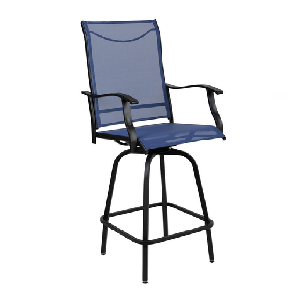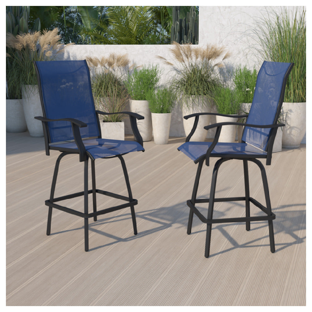The Flash Furniture 2-ET-SWVLPTO-30-NV-GG Patio Swivel Stool 300 Lb. Weight Capacity is a meticulously designed piece ideal for outdoor settings. This bar-height stool boasts a sturdy black galvanized steel frame, ensuring durability and longevity in various weather conditions. The stool supports a substantial weight capacity of 300 lb., catering to a wide range of users. Its standout features include a rectangular transparent mesh full back and a transparent mesh waterfall seat, providing both aesthetic appeal and comfort. The curved scroll arms add a touch of elegance, while the footrest enhances user comfort during extended seating periods. The blue textilene sling fabric not only offers a vibrant color contrast but also ensures a breathable and comfortable seating experience. This stool is designed for those who value both function and style in their outdoor furniture. The set of two stools requires assembly, and in-stock items are typically shipped within 24 hours, making it a convenient choice for immediate outdoor furnishing needs. With its combination of robust construction and thoughtful design, this swivel stool is a versatile addition to patios, gardens, and outdoor bars, appealing to homeowners, hospitality venues, and outdoor event organizers alike.