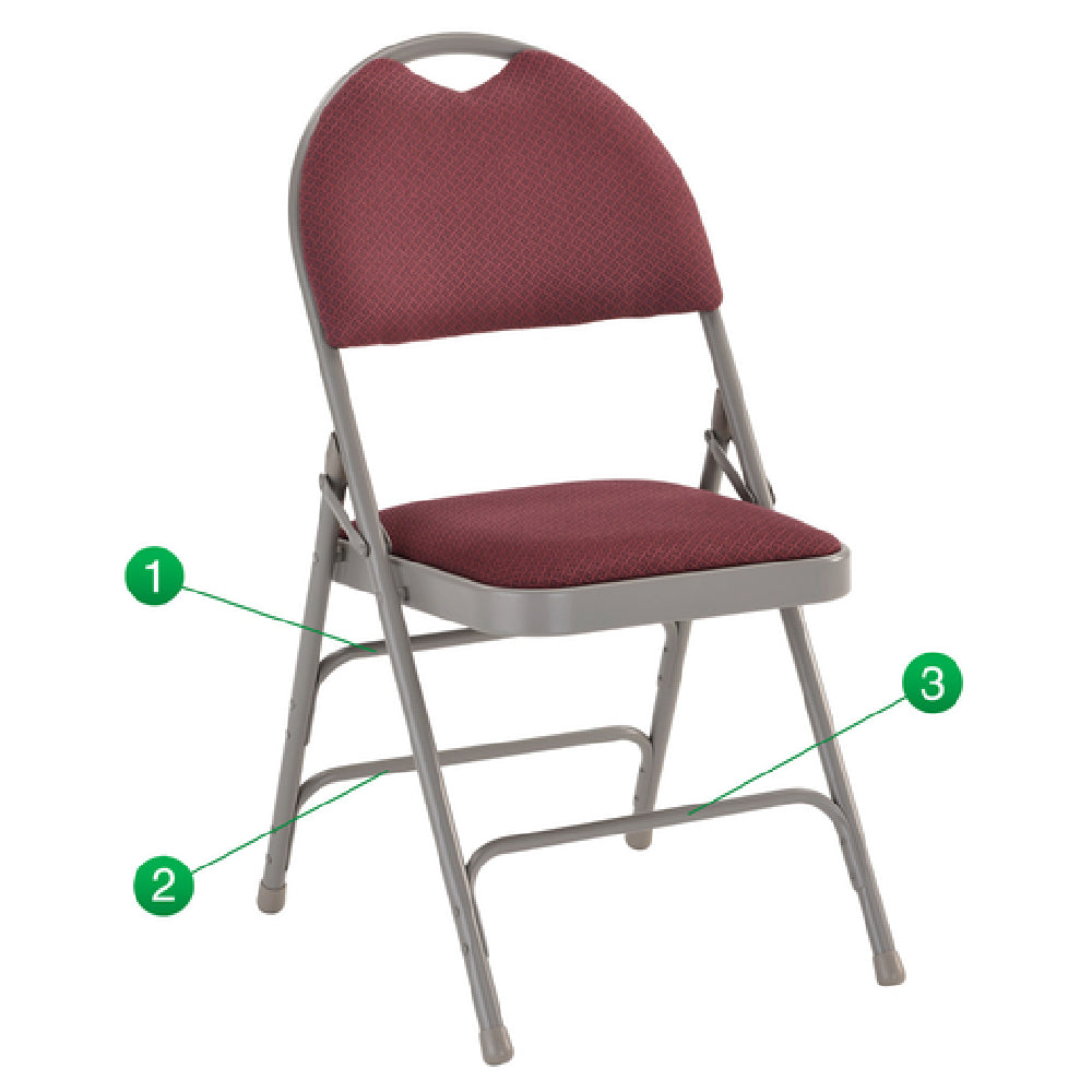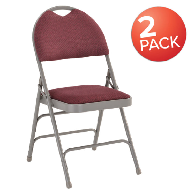 The Flash Furniture 2-HA-MC705AF-3-BY-GG Hercules Series Extra Large Ultra-Premium Folding Chair is a robust seating solution designed for both indoor and outdoor commercial use, featuring a remarkable 300 lb. weight capacity. Engineered with a curved triple-braced frame and double-hinged, riveted steel components, this chair ensures exceptional stability and durability. The 18-gauge steel frame is finished with a gray powder coat, providing resilience and a sleek appearance. Comfort is prioritized with a fabric upholstered seat and back, complemented by a 1-inch thick CA117 fire retardant foam seat. The chair's non-marring glides protect floors from scuffs, making it ideal for diverse environments. A convenient carrying handle cutout enhances portability, allowing for effortless transport and setup. Offered in a rich burgundy color, this folding chair is available as a set of two, catering to events, conferences, and hospitality settings where style and comfort are paramount. In-stock items are typically shipped within 24 hours, ensuring swift delivery for urgent requirements. The Hercules Series folding chair represents a blend of functionality, safety, and aesthetics, meeting the demands of various market segments within the commercial furniture industry.