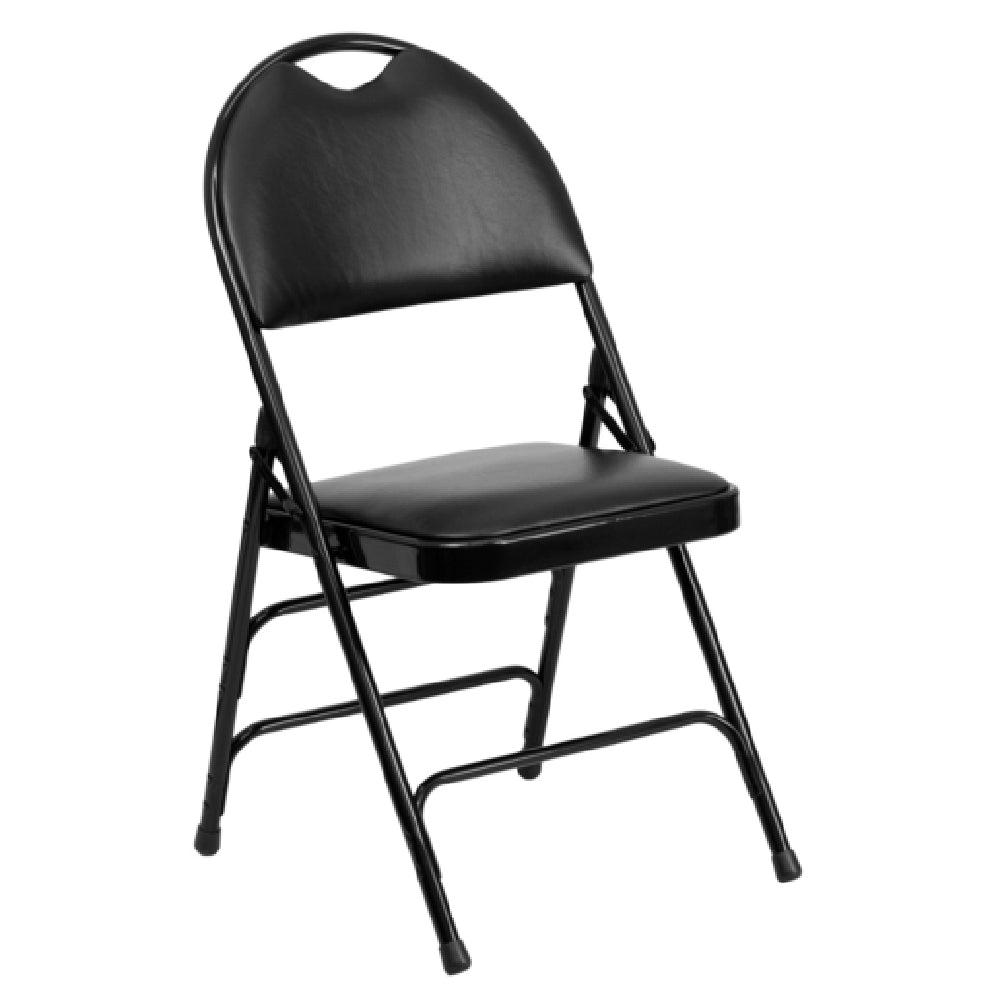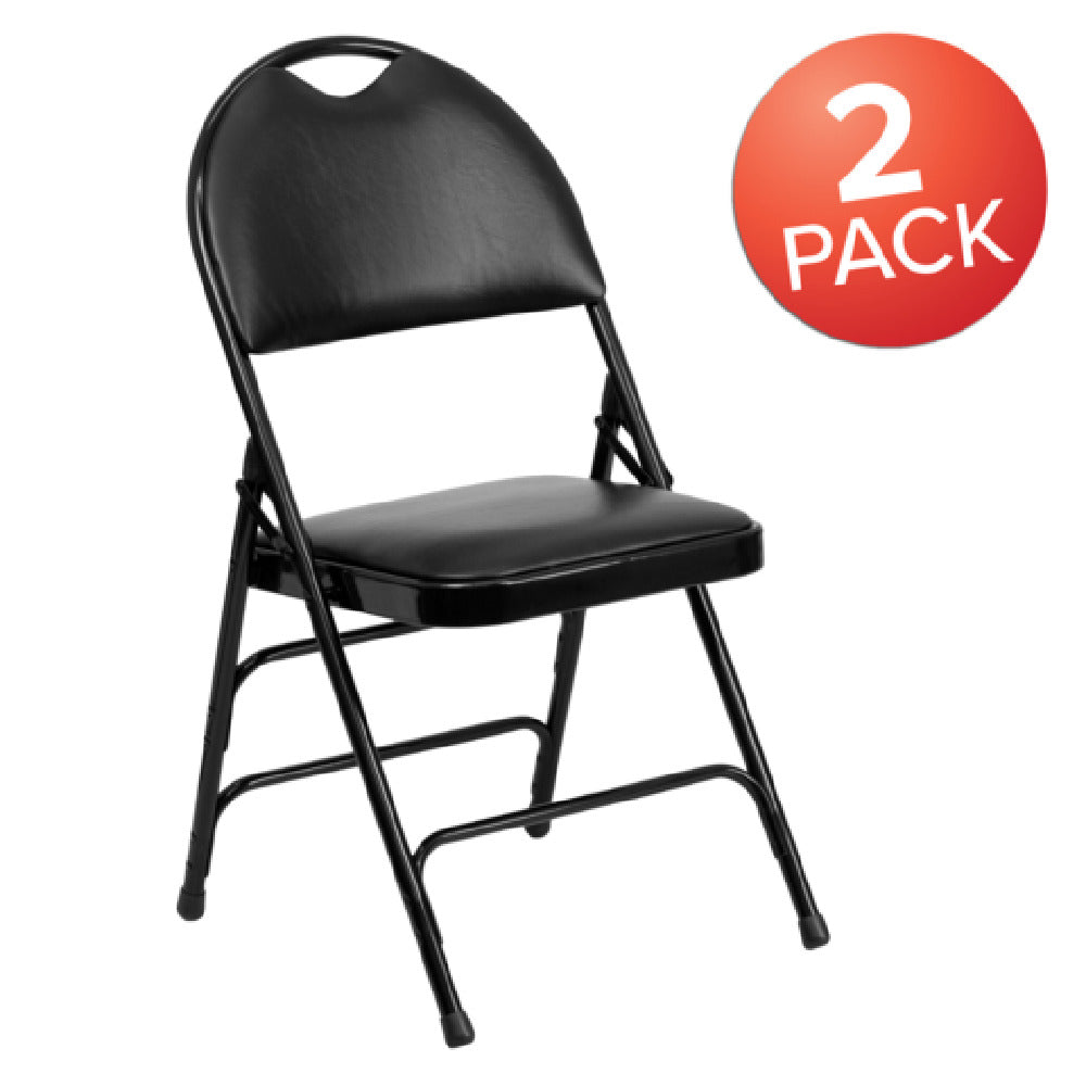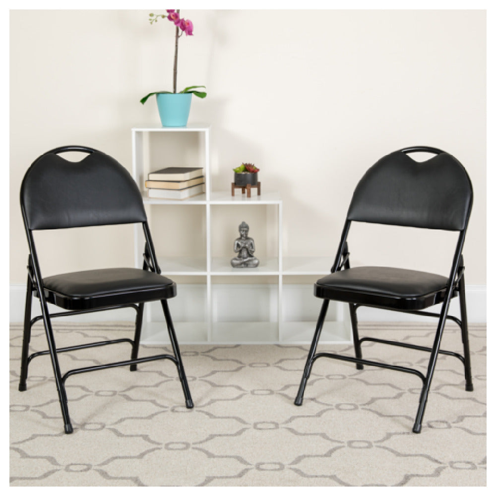 Flash Furniture 2-HA-MC705AV-3-BK-GG Hercules Series Extra Large Ultra-Premium Folding Chair stands out as a robust seating solution with a substantial weight capacity of 300 lb, making it suitable for various settings from event halls to residential patios. This folding chair features a vinyl upholstered seat and back, providing both comfort and durability. The seat is equipped with a 1-inch thick CA117 fire retardant foam, enhancing safety and comfort. Built with a curved triple-braced frame and double-hinged design, the chair delivers outstanding stability and support. The riveted steel components and 18-gauge steel frame ensure a long-lasting construction with a sleek black finish. To protect floors from scratches, non-marring glides are integrated into the design. Additionally, it includes a carrying handle cutout for easy mobility, making it ideal for both indoor and outdoor commercial use. Supplied in a set of two, these chairs are typically in stock and ready to ship within 24 hours, offering a quick and reliable seating option for any occasion.