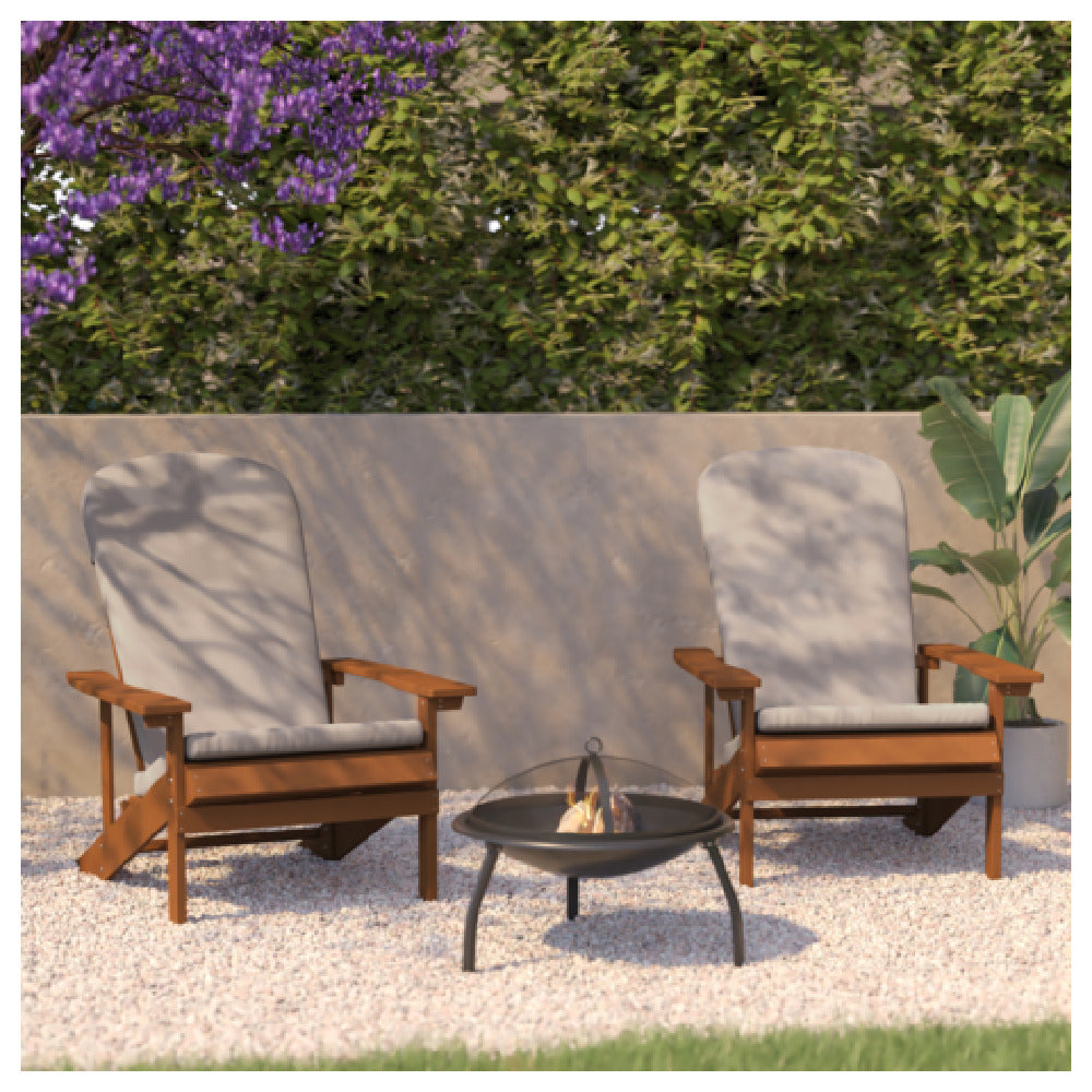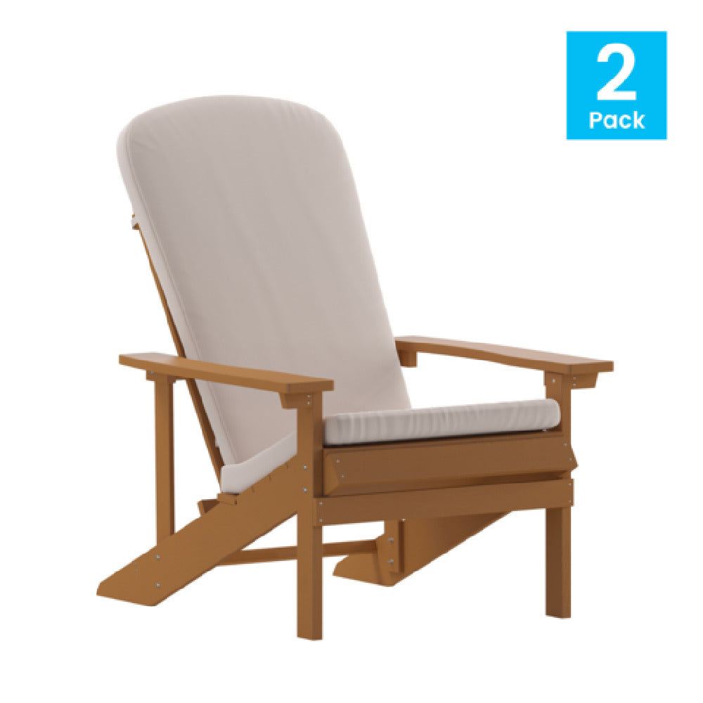 The Flash Furniture 2-JJ-C14501-CSNCR-TEAK-GG Charlestown Adirondack Chair is designed for durability and style, featuring all-weather poly resin wood construction ideal for outdoor environments. This set of two chairs showcases a teak finish complemented by cream cushions, offering a sophisticated aesthetic suitable for diverse settings, from residential patios to commercial outdoor spaces. The poly resin wood material replicates the beauty of natural wood while providing superior resistance to the elements, ensuring long-lasting use with minimal maintenance. The ergonomic design of the Charlestown Adirondack Chair promotes comfort and relaxation, making it a perfect addition to any outdoor furniture collection. This versatile product caters to both private homeowners looking to enhance their gardens and hospitality businesses aiming to provide their guests with premium outdoor seating options. The combination of aesthetic appeal, robust construction, and weather-resistant materials makes the Flash Furniture Charlestown Adirondack Chair a valuable investment for anyone seeking quality outdoor furnishings. With its classic design and practical features, it seamlessly blends into various decor styles, offering a reliable seating solution that doesn't compromise on comfort or elegance.