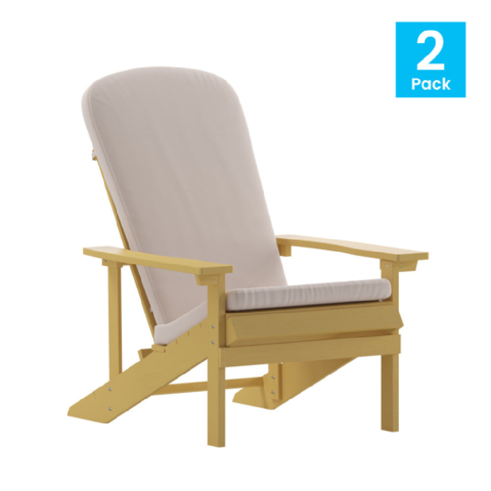 The Flash Furniture 2-JJ-C14501-CSNCR-YLW-GG Charlestown Adirondack Chair is a thoughtfully designed seating solution crafted to enhance both outdoor aesthetics and comfort. This set of two chairs is constructed from all-weather poly resin wood, offering durability and resistance to the elements, making it an ideal choice for outdoor spaces. The vibrant yellow finish, complemented by cream cushions, adds a cheerful and inviting touch to patios, gardens, or beachfronts. Targeting diverse market segments, from residential homeowners seeking stylish and durable outdoor furniture to commercial spaces like resorts and cafes desiring visually appealing seating options, this Adirondack chair set stands out for its combination of visual appeal and practical functionality. The poly resin material ensures longevity, resisting fading and weathering over time, while the ergonomic design promises comfortable seating experiences. These features collectively contribute to a versatile and attractive outdoor furniture solution that meets the needs of various environments and user preferences.