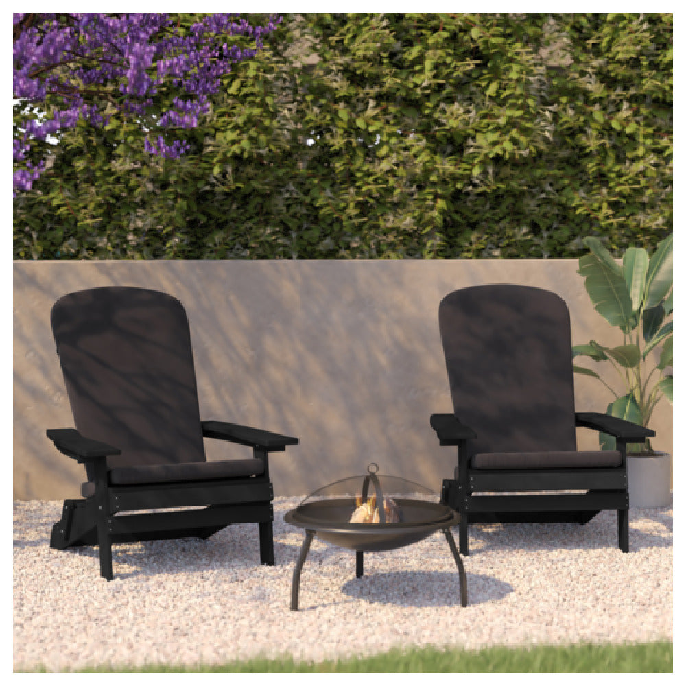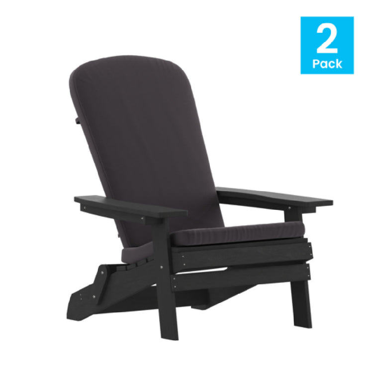 The Flash Furniture 2-JJ-C14505-CSNGY-BLK-GG Charlestown Folding Adirondack Chair is a versatile seating solution, engineered for both indoor and outdoor environments. This set of two chairs is crafted from all-weather poly resin wood, ensuring durability and resistance to various weather conditions, making it an excellent choice for patios, gardens, and other outdoor spaces. The chairs feature a sleek black finish complemented by gray cushions, providing a modern and stylish aesthetic suitable for any setting. Designed with convenience in mind, these Adirondack chairs are foldable, allowing for easy storage and transport. This feature is especially beneficial for users who have limited space or frequently rearrange their outdoor furniture setup. The unique value proposition of this product lies in its combination of robust construction materials and user-friendly design, catering to a diverse range of market segments such as homeowners seeking long-lasting outdoor furniture, hospitality establishments aiming to enhance their outdoor guest areas, and event planners requiring adaptable seating solutions. The Flash Furniture Charlestown Folding Adirondack Chair balances form and function, offering a reliable and stylish seating option for a variety of applications.