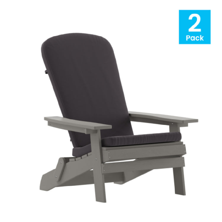 The Flash Furniture 2-JJ-C14505-CSNGY-GY-GG Charlestown Folding Adirondack Chair is designed to blend style and functionality, making it suitable for both indoor and outdoor use. Crafted from all-weather poly resin wood, this chair offers durability and resilience against the elements, ensuring longevity and minimal maintenance. The chair's folding feature allows for convenient storage and transport, catering to spaces where flexibility is crucial. Available in a sophisticated gray tone, it includes complementary gray cushions that enhance comfort, making it an ideal choice for relaxation in any setting. This set comprises two chairs, providing a cohesive look for patios, gardens, or indoor spaces. The use of poly resin wood not only contributes to the chair's robust build but also maintains a classic wooden appearance without the susceptibility to traditional wood's wear and tear. This product serves various market segments, from residential homeowners seeking stylish outdoor furniture to commercial establishments like cafes or resorts looking for durable seating options. The combination of aesthetic appeal, practical features, and enduring materials positions the Flash Furniture Charlestown Folding Adirondack Chair as a versatile and valuable addition to any environment, promising a blend of comfort, convenience, and style.
