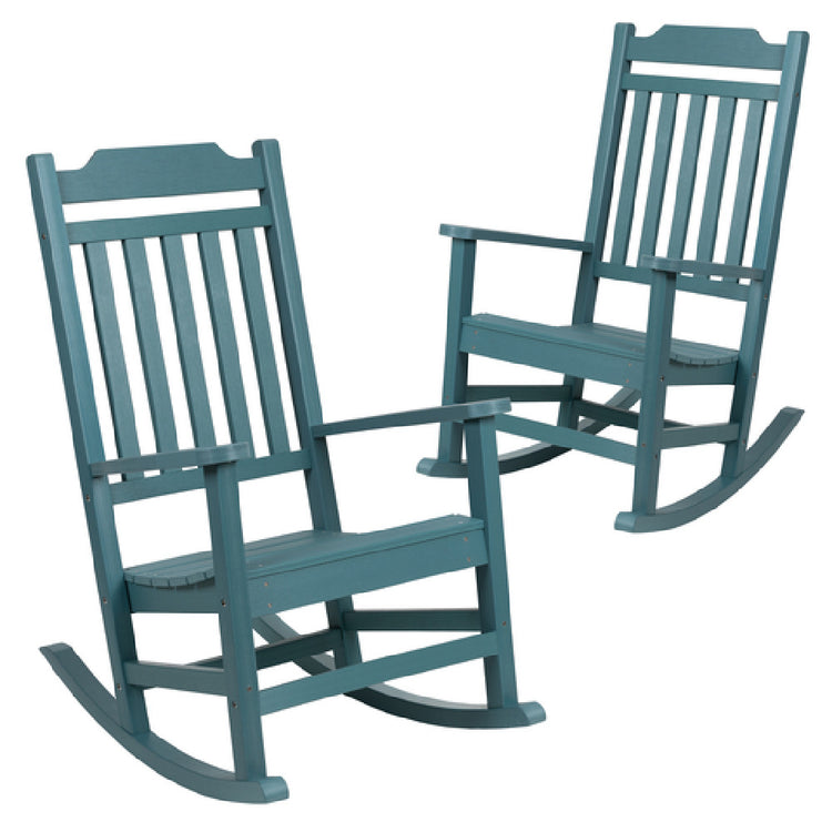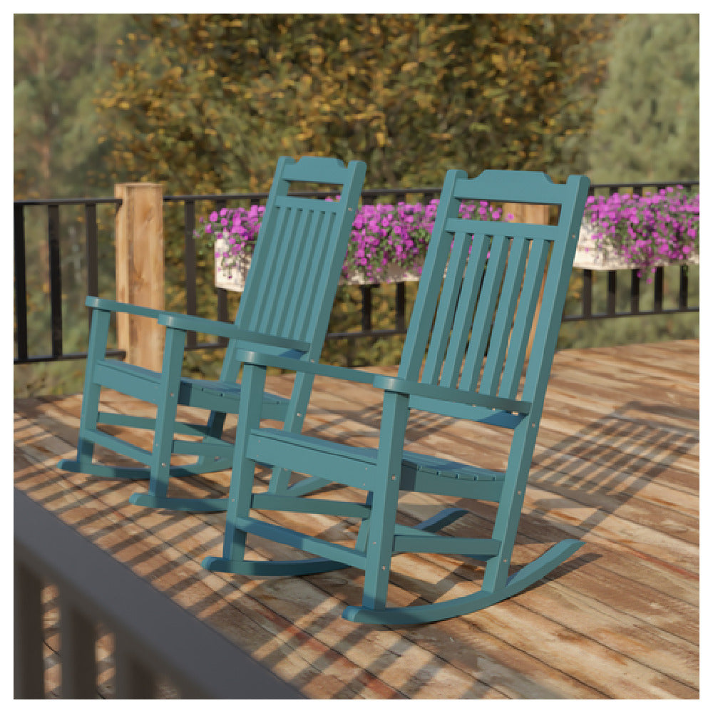 The Flash Furniture 2-JJ-C14703-TL-GG Rocking Chair is a robust seating solution designed to meet diverse needs, offering a commendable 225 lb. weight capacity. Crafted from polystyrene faux wood, this chair combines the aesthetic appeal of traditional wood with the durability and ease of maintenance associated with synthetic materials. This model is finished in a vibrant teal color, adding a touch of modern style to any space. Sold as a set of two, it presents an excellent option for both residential and commercial environments, such as patios, living rooms, or waiting areas. The rocking chair design provides a classic and comforting motion, making it ideal for relaxation and leisure across different market segments. Whether for a home setting or a business lounge, the Flash Furniture 2-JJ-C14703-TL-GG Rocking Chair balances functionality and style, making it a versatile addition to various settings. The use of faux wood not only enhances its aesthetic appeal but also ensures that the chairs are weather-resistant and suitable for outdoor use, catering to the needs of diverse customer bases. This combination of style, durability, and comfort positions the Flash Furniture rocking chair as a valuable piece for enhancing both indoor and outdoor environments.