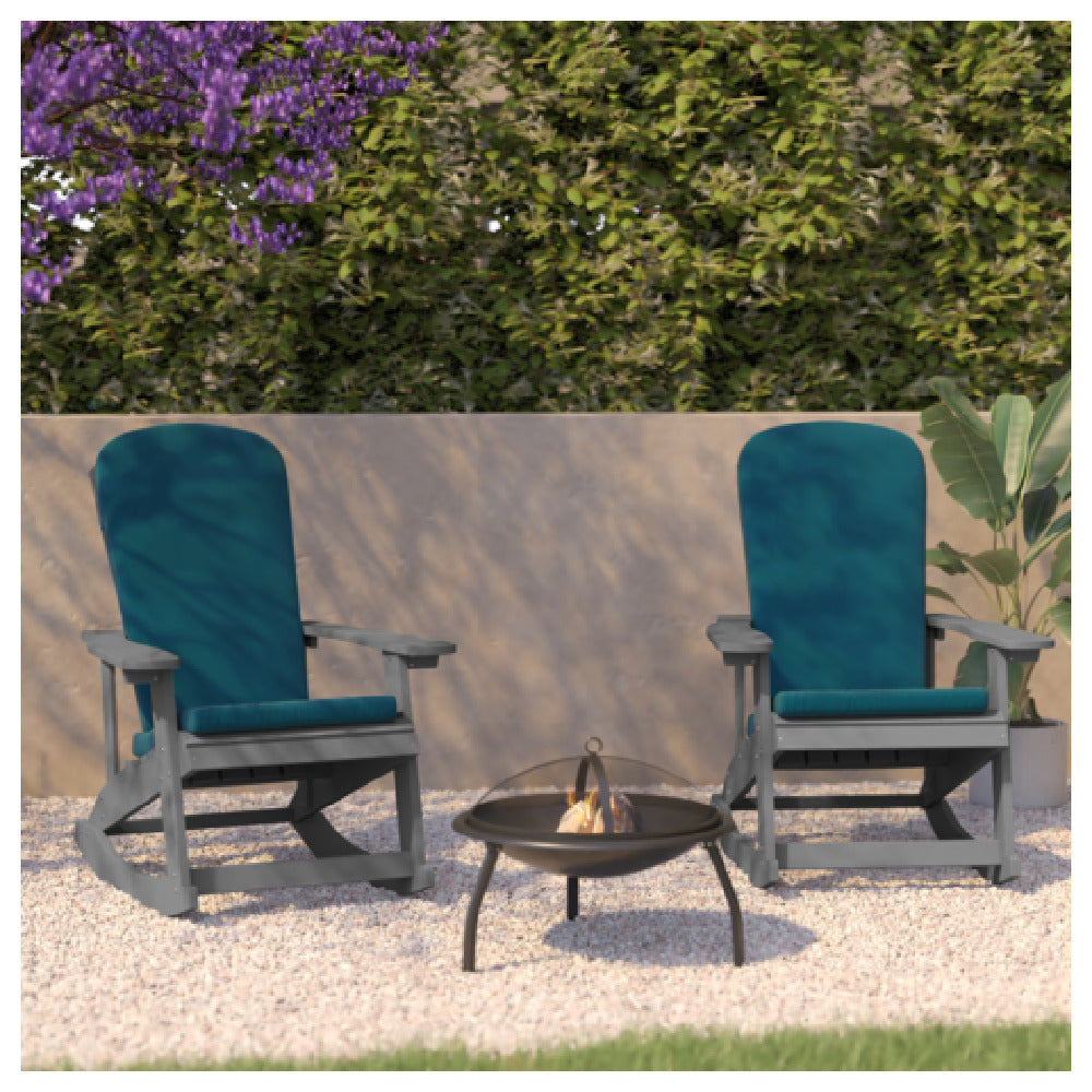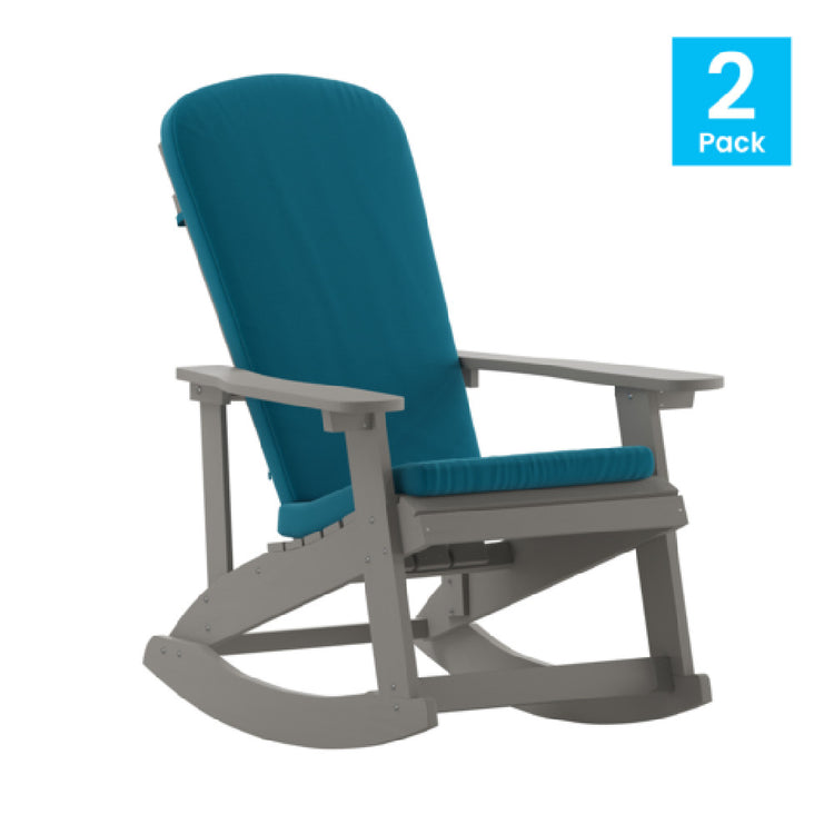 The Flash Furniture 2-JJ-C14705-CSNTL-GY-GG Savannah Adirondack Rocking Chair is a versatile seating option crafted for outdoor enthusiasts looking for durability and style. Constructed from all-weather poly resin wood, this chair ensures longevity and resilience against the elements, making it an ideal choice for patios, gardens, or terraces. The chair's sophisticated gray hue, complemented by teal cushions, adds a touch of elegance and comfort, enhancing your outdoor experience. Sold as a set of two, these rocking chairs provide a perfect blend of function and aesthetics, catering to both residential and commercial outdoor spaces. The ergonomic design of the Adirondack style promotes relaxation, while the addition of a rocking feature brings a soothing motion to your leisure time. These chairs are tailored for diverse market segments, from homeowners seeking aesthetic outdoor furniture to hospitality businesses needing sturdy, weather-resistant seating solutions. The Flash Furniture Savannah Adirondack Rocking Chair stands out for its combination of classic design and modern materials, offering a unique value proposition for those who prioritize both style and practicality in outdoor furniture. With its robust construction and appealing color scheme, it appeals to a wide range of outdoor furnishing needs.
