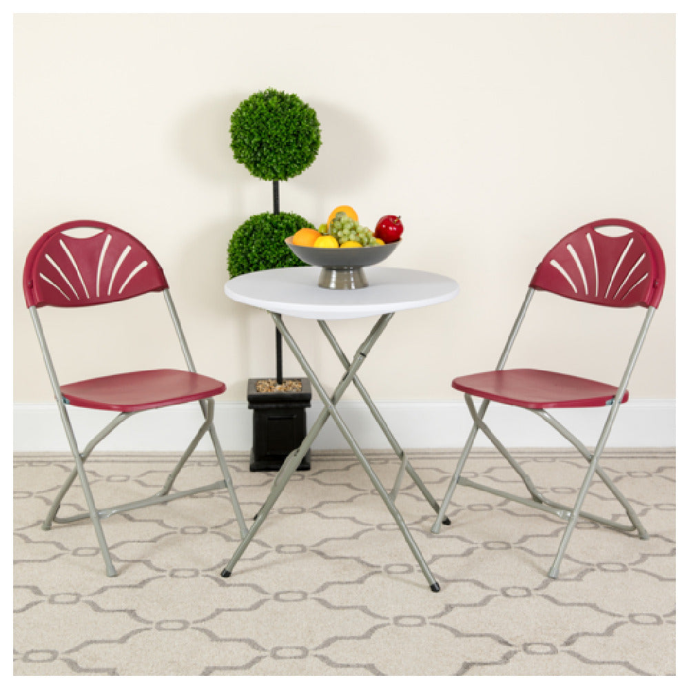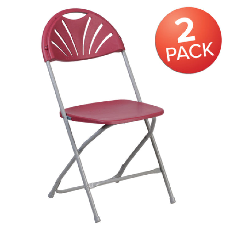 The Flash Furniture 2-LE-L-4-BUR-GG Hercules Series Folding Chair is engineered for strength and convenience, boasting a remarkable 650 lb. weight capacity. This chair is designed with a lightweight framework, making it easy to transport and handle, yet it features a robust 18-gauge steel frame that ensures durability and stability. The chair's plastic contoured back and seat provide ergonomic support, while the ventilated fan back enhances airflow for added comfort. Its textured seat offers a non-slip surface, and the double support rails add extra reinforcement, ensuring reliability in various settings. Finished with a white powder-coated frame, this chair is not only stylish but also resistant to wear and tear. The non-marring floor caps prevent damage to flooring, making it suitable for both indoor and outdoor commercial use. Its space-saving nesting design allows for efficient storage when not in use. Available in a burgundy finish and sold as a set of two, in-stock items typically ship within 24 hours, making it a practical choice for markets ranging from event venues to educational institutions seeking high-capacity, durable seating solutions.