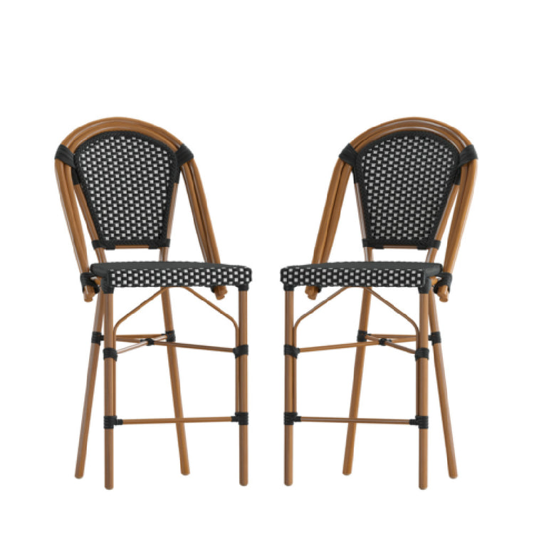 The Flash Furniture 2-SDA-AD642001-CS-BKWH-NAT-GG Bordeaux Stacking French Bistro Stool is a versatile seating solution, designed to adapt seamlessly to various environments. With a substantial weight capacity of 600 lb, these stools are robust and reliable, catering to both commercial and residential settings. The 26-inch counter seat height makes them an ideal fit for standard counter spaces, while the black and white polyethylene rattan back and seat offer a visually appealing aesthetic and water-resistant durability. The stools' frame features a natural finish bamboo print on aluminum, providing the elegance of bamboo with the strength and longevity of metal. Equipped with floor glides, these stools protect flooring surfaces from scratches and scuffs. Designed for both indoor and outdoor use, they effortlessly blend functionality with style. The ability to stack up to 5 chairs high maximizes storage efficiency, making them suitable for cafes, restaurants, and home patios where space-saving is crucial. Sold in sets of 2, these stools come fully assembled, ensuring immediate usability upon delivery. Their thoughtful design combines classic French bistro charm with modern materials and construction, rendering them a practical and stylish choice across different market segments in the hospitality industry.