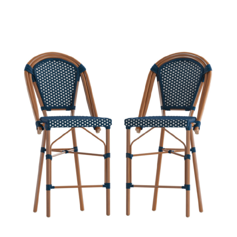 The Flash Furniture 2-SDA-AD642001-CS-NVYWH-NAT-GG Bordeaux Stacking French Bistro Stool is a versatile seating solution crafted for both indoor and outdoor environments. With a substantial weight capacity of 600 lb, this stool is built to accommodate a range of users comfortably. Its 26-inch counter seat height makes it an ideal fit for various bar and counter settings. The stool's navy and white polyethylene rattan back and seat provide both style and durability, while the natural finish bamboo print aluminum frame ensures a lightweight yet sturdy construction. Designed with practicality in mind, the stool features floor glides that protect surfaces and enhance stability. Its ability to stack up to five chairs high allows for efficient storage, making it suitable for businesses with fluctuating space requirements. Sold in a convenient set of two, these stools require no assembly, offering immediate use right out of the box. The combination of elegant design and functional attributes makes the Bordeaux Stacking French Bistro Stool a valuable asset for cafes, restaurants, and home kitchens looking for a blend of aesthetic appeal and reliability.