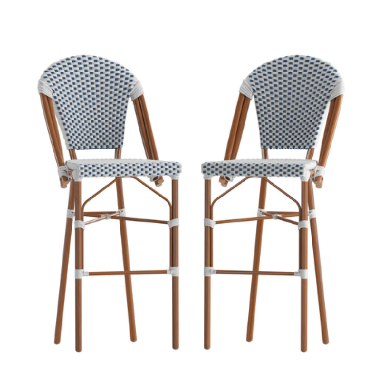 Flash Furniture 2-SDA-AD642001-F-BS-WHNVY-NAT-GG Lourdes Stacking French Bistro Stool is a versatile seating solution designed for both indoor and outdoor settings, catering to a variety of commercial and residential environments. With a robust weight capacity of 600 lb., this stool is built to provide reliable support in any setting. It features a 30" bar seat height, making it an excellent choice for bar and counter seating arrangements. The stool showcases a stylish white and navy polyethylene rattan back and seat, offering both comfort and aesthetic appeal. Its natural finish bamboo print aluminum frame not only enhances its visual appeal but also ensures durability and resistance to weather elements. The inclusion of floor glides allows for easy movement without damaging floors, while the stool's stackable design enables efficient storage, with the ability to stack up to 5 chairs high. Sold in a convenient set of 2, these stools require no assembly, offering immediate usability. This product is perfect for diverse market segments, including hospitality, dining, and home environments, where style, functionality, and ease of use are paramount. Its combination of durability, design, and practical features make it a valuable addition to any seating arrangement.
