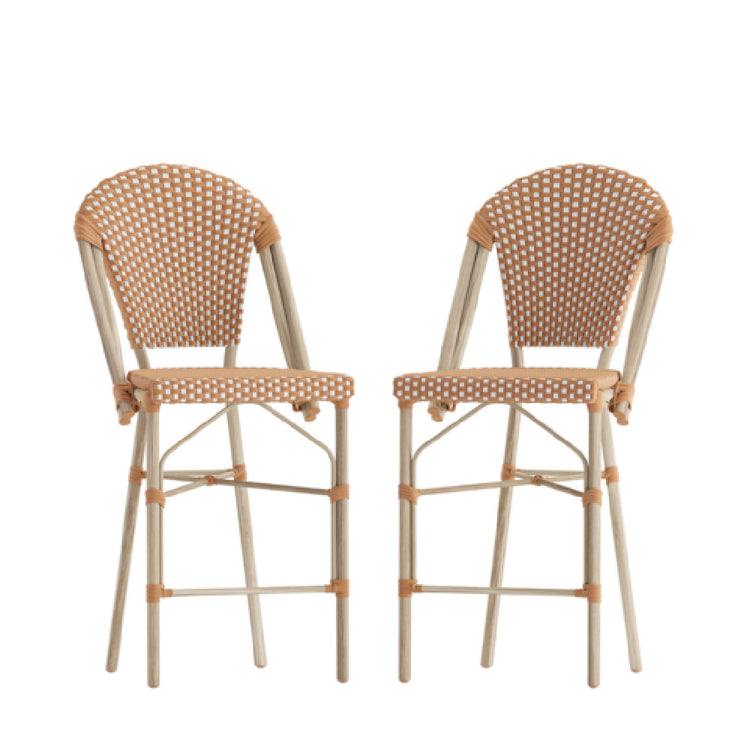 The Flash Furniture 2-SDA-AD642001-F-CS-NATWH-LTNAT-GG Lourdes Stacking French Bistro Stool is a versatile seating solution designed for both indoor and outdoor environments. With a sturdy weight capacity of 600 lb, this stool is engineered to provide reliable support. Its 26-inch counter seat height makes it a suitable choice for a variety of settings, from casual dining areas to stylish outdoor patios. The stool features a natural and white polyethylene rattan back and seat, offering a blend of classic aesthetics and modern durability. The light natural finish aluminum frame not only enhances its visual appeal but also ensures resistance to weathering, making it ideal for outdoor use. Floor glides are included to protect surfaces from scratches and scuffs. One of the standout features of this bistro stool is its stackability, allowing up to 5 chairs to be stacked for convenient storage, which is a valuable space-saving benefit for cafes and restaurants. Sold as a set of 2, these stools require no assembly, providing immediate usability. The combination of these features makes the Lourdes Stacking French Bistro Stool a practical and stylish choice for diverse market segments, including hospitality, residential, and commercial spaces.