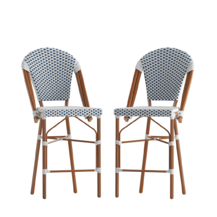 The Flash Furniture 2-SDA-AD642001-F-CS-WHNVY-NAT-GG Lourdes Stacking French Bistro Stool is a versatile seating solution designed to meet the functional needs of both residential and commercial spaces. This stool boasts a substantial 600 lb. weight capacity, ensuring robust support for various users. Its 26-inch counter seat height is ideal for standard counter use, making it a perfect fit for kitchens or dining areas. The white and navy polyethylene rattan back and seat provide comfort and durability while adding a touch of elegance to any setting. Its natural finish bamboo print aluminum frame not only enhances its aesthetic appeal but also ensures stability and strength. Designed for both indoor and outdoor use, the Lourdes Stool is equipped with floor glides to protect surfaces and allow for easy movement. One of its standout features is its stackability, accommodating up to 5 chairs high, which is particularly advantageous for spaces that require flexible seating arrangements. Offered in a convenient set of 2, these stools arrive fully assembled, providing an immediate seating solution without the hassle of assembly. Ideal for cafes, patios, and casual dining environments, this stool combines style with practicality, catering to a diverse market segment.