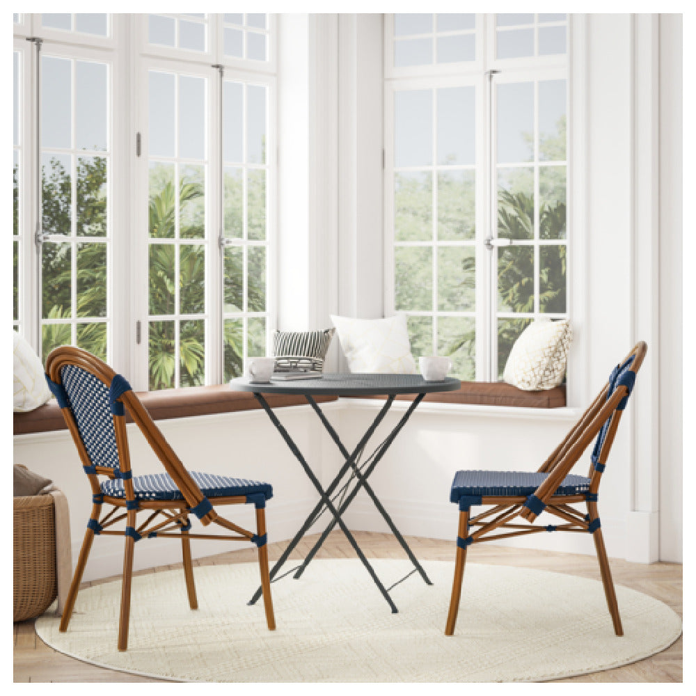 The Flash Furniture 2-SDA-AD642001-NVYWH-NAT-GG Bordeaux Stacking French Chair is a versatile seating solution designed for both indoor and outdoor environments, combining durability and style with its impressive 400 lb. weight capacity. This chair features a navy and white polyethylene rattan back and seat, offering a vibrant and chic aesthetic. The natural finish bamboo print aluminum frame not only enhances its elegant look but also ensures strength and resilience against various weather conditions. Designed with practical floor glides, this chair protects flooring surfaces, making it ideal for cafes, restaurants, and home patios. Its unique stacking capability allows for easy storage, accommodating up to 5 chairs high, perfect for spaces that require flexible seating arrangements. Sold in a convenient set of 2, these chairs come fully assembled, offering immediate use upon delivery. This product effectively caters to the hospitality industry, event planners, and homeowners seeking functional yet stylish seating options that seamlessly integrate into various decor styles while providing lasting comfort and support.