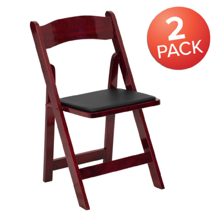 The Flash Furniture 2-XF-2903-MAH-WOOD-GG Hercules Series Folding Chair is a lightweight seating solution designed for versatility and durability across various settings. Featuring a black padded vinyl upholstered seat, this chair provides comfort and is equipped with a waterproof detachable seat for added practicality. Constructed from robust beechwood, it boasts a sophisticated mahogany finish complemented by a clear lacquer varnish, enhancing its aesthetic appeal and longevity. This folding chair is engineered for both indoor and outdoor commercial use, making it suitable for venues such as banquet halls, conference centers, and outdoor events. Sold in a set of two, these chairs combine style and functionality, catering to the needs of diverse market segments. The chair's design focuses on ease of use, with its foldable structure allowing for convenient storage and transport. Typically, in-stock items are ready for dispatch within 24 hours, ensuring timely availability for customers. The Flash Furniture Hercules Series Folding Chair is a reliable choice for those seeking a blend of quality craftsmanship and functional design.