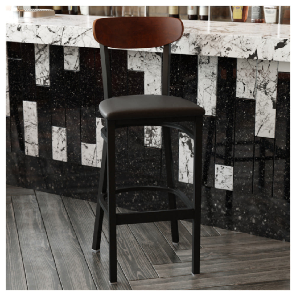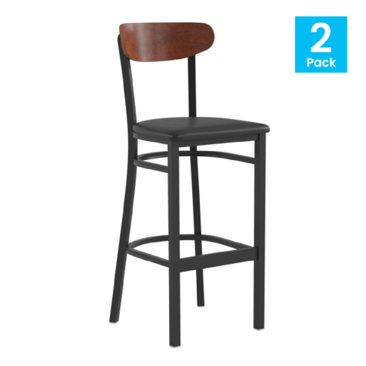The Flash Furniture 2-XU-DG6V6BV-WAL-GG Wright Bar Stool is engineered to deliver both durability and style, boasting a remarkable 500 lb weight capacity. This set of two bar stools features a sleek black vinyl upholstered seat that provides comfortable seating while maintaining an easy-to-clean surface. The design is distinguished by a wooden boomerang back, adding a sophisticated touch with its walnut finish. The stools are supported by a sturdy black steel frame, ensuring long-lasting use in various environments, from commercial bars to home kitchens. For added stability and ease of use, these stools include a lower bracing footrest and fixed floor glides, making them suitable for different flooring types. While assembly is required, the robust construction and thoughtful design make the Flash Furniture Wright Bar Stool a versatile choice across different market segments, especially where strength and aesthetics are priorities. These attributes, combined with the stylish walnut finish, enable this product to blend seamlessly into diverse settings, catering to both contemporary and traditional decor styles.