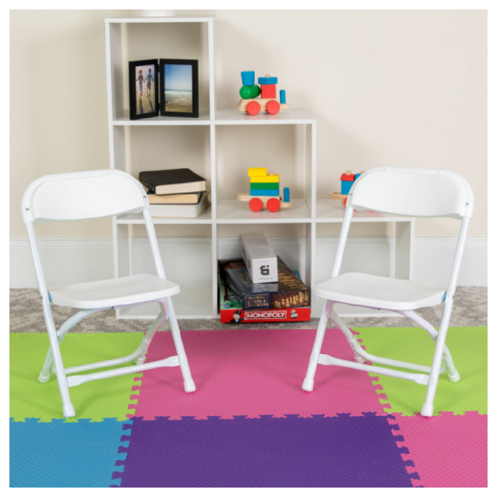 Flash Furniture 2-Y-KID-WH-GG Timmy Folding Chair is a versatile seating solution designed with both functionality and safety in mind, ideal for young children in settings such as preschools and kindergartens. Featuring a robust 220 lb. weight capacity, this chair ensures durability and security for various users. The dimensions of the chair when folded are a compact 13"W x 2-1/4"D x 25"H, making it easy to store and transport as needed. The chair is constructed with a plastic back and seat, providing a comfortable and lightweight seating option. The textured seat enhances stability and prevents slipping, adding an extra layer of safety for its young users. Its white powder-coated steel frame not only adds a sleek aesthetic but also provides strong support and resistance to wear and tear. The inclusion of floor caps protects flooring surfaces from scratches, ensuring it is a practical choice for any classroom environment. Sold as a set of two, the Flash Furniture Timmy Folding Chair is an excellent choice for educators and caregivers looking for reliable, safe, and space-efficient seating for children in educational settings.
