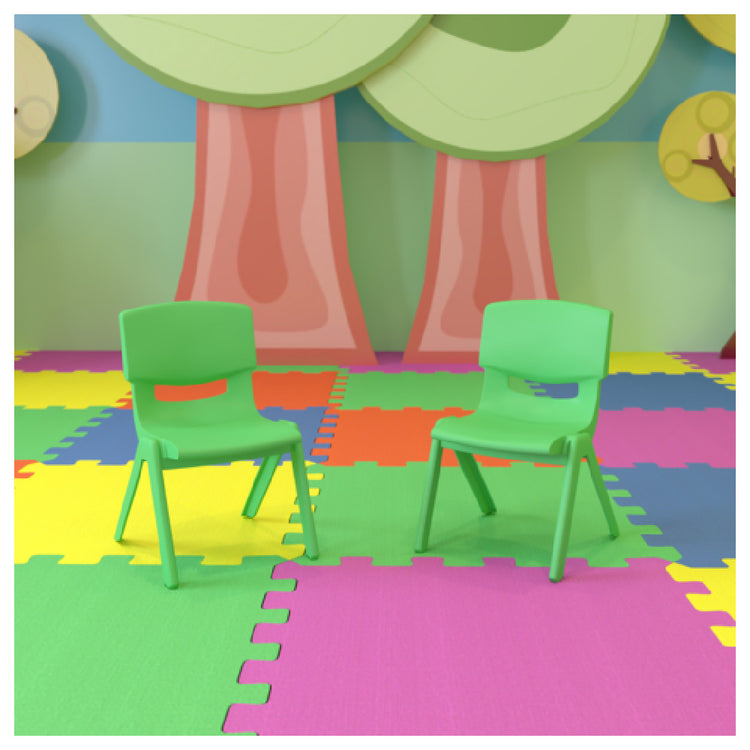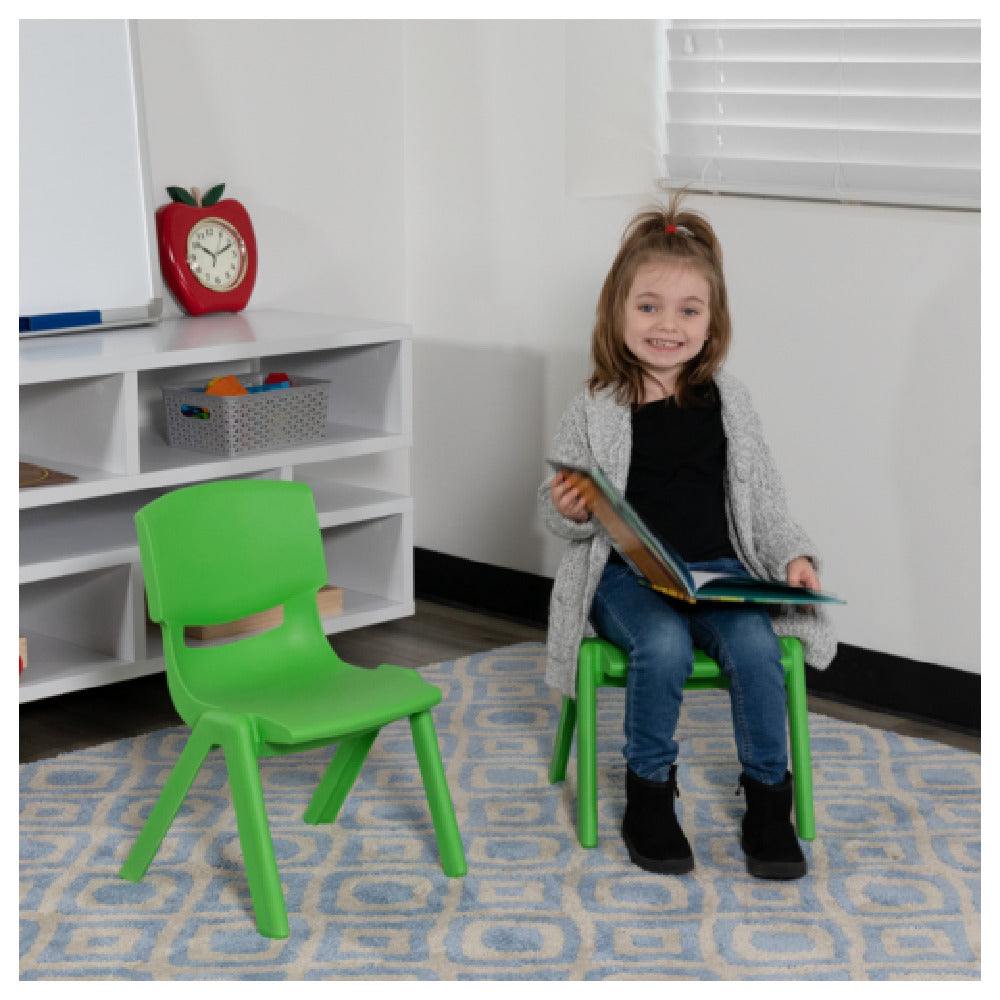 The Flash Furniture 2-YU-YCX-003-GREEN-GG Whitney Stacking Chair is a versatile seating solution designed with functionality and durability in mind. Featuring a 154 lb. weight capacity, this chair is crafted from sturdy polypropylene material, ensuring longevity and resilience, particularly suited for preschool and kindergarten environments. The chair boasts a seat height of 10-1/2 inches, which is ideal for young children, promoting comfort and correct posture during use. One of the standout features is its ability to stack up to 10 chairs high, facilitating easy storage and space-saving advantages in classroom settings. This green stacking chair comes in a set of two and is delivered fully assembled, eliminating the need for additional setup. The Flash Furniture Whitney Stacking Chair is specifically tailored to meet the demands of educational settings, offering practical and reliable seating for young learners, making it an essential addition to any early childhood educational facility.