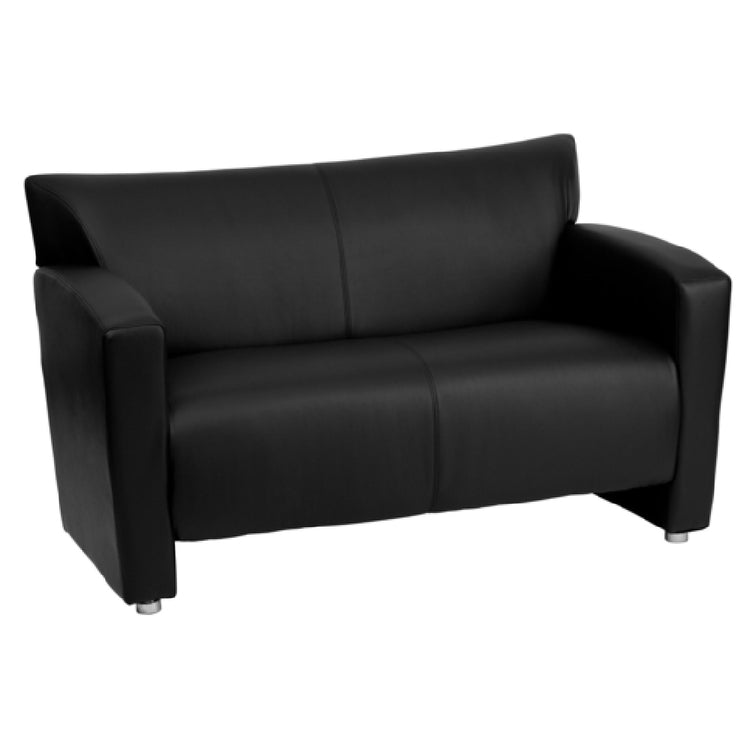 The Flash Furniture 222-2-BK-GG Hercules Majesty Series Reception Loveseat is a meticulously crafted seating solution perfect for various reception and lounge environments. This elegant loveseat measures 51 inches in width, 30 inches in depth, and 31-1/4 inches in height, providing ample space without overwhelming smaller areas. Its LeatherSoft upholstery combines the richness of leather with the durability and easy maintenance of polyurethane, offering both luxury and practicality. The loveseat's design features flared arms and a sculpted seat and back, ensuring ergonomic comfort and an inviting aesthetic. A fixed seat cushion is filled with 1.8 high-density CA117 fire-retardant foam, prioritizing both safety and comfort. The loveseat's sturdy hardwood construction ensures long-lasting durability, while brushed aluminum feet add a touch of modern sophistication. Available in classic black, this piece requires assembly and is designed to seamlessly integrate into various interior designs, from corporate receptions to residential living spaces. In-stock items typically ship within 24 hours, ensuring a swift addition to any setting. The Flash Furniture 222-2-BK-GG Hercules Majesty Series Reception Loveseat is an exemplary choice for those seeking a blend of style, comfort, and safety in their seating selections.