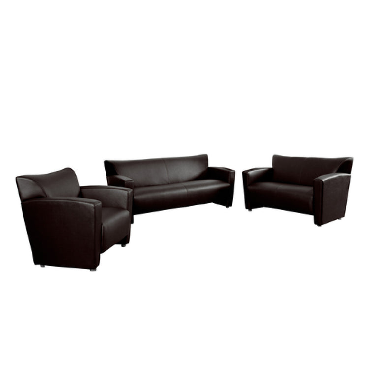 The Flash Furniture 222-SET-BN-GG Hercules Majesty Series Reception Set is an exquisite ensemble perfect for enhancing the elegance of any reception area. This set includes a meticulously crafted chair measuring 31-1/4"W x 30"D x 31-1/4"H, a spacious loveseat at 51"W x 30"D x 31-1/4"H, and a generous sofa with dimensions of 68-1/2"W x 30"D x 31-1/4"H. Each piece is upholstered in LeatherSoft, a material known for its durable and soft texture, combining leather and polyurethane for added comfort. The design features flared arms and sculpted seats and backs, providing a modern aesthetic while ensuring ergonomic support. The fixed seat cushions are filled with 1.8 high-density CA117 fire retardant foam, offering both safety and comfort. Constructed with a sturdy hardwood frame and complemented by brushed aluminum feet, this set guarantees stability and a contemporary look. Available in an elegant brown hue, the reception set requires assembly and is delivered in three boxes, with in-stock items typically shipping within 24 hours. This reception set is a versatile choice for corporate offices, hospitality venues, or any space looking to blend style with functionality.