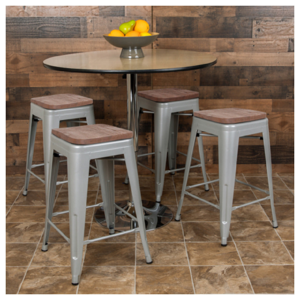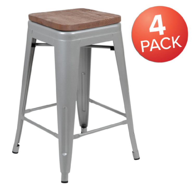 The Flash Furniture 4-ET-31320W-24-SV-R-GG Cierra Indoor Bar Stool is a versatile seating solution designed to cater to a wide range of settings. With a substantial weight capacity of 440 lb., this bar stool ensures durability and strength, making it suitable for both commercial and residential use. Each stool measures 16"W x 16"D x 24"H, providing a compact, comfortable seating option that fits seamlessly into various environments, from bustling bars to cozy kitchens. The stool's stackable design is particularly advantageous for spaces requiring easy storage and efficient floor space utilization. Constructed with a sturdy metal frame and complemented by a wood seat, this stool combines industrial strength with a touch of natural elegance. The addition of a footrest enhances user comfort, while the protective plastic floor guide ensures surfaces remain unscathed during use. Available in a sleek silver finish and offered as a set of four, the Flash Furniture Cierra Indoor Bar Stool is a practical and stylish choice for those seeking reliable and aesthetically pleasing seating options. Its thoughtful design and robust construction make it an appealing choice across various market segments, including hospitality, retail, and home settings.