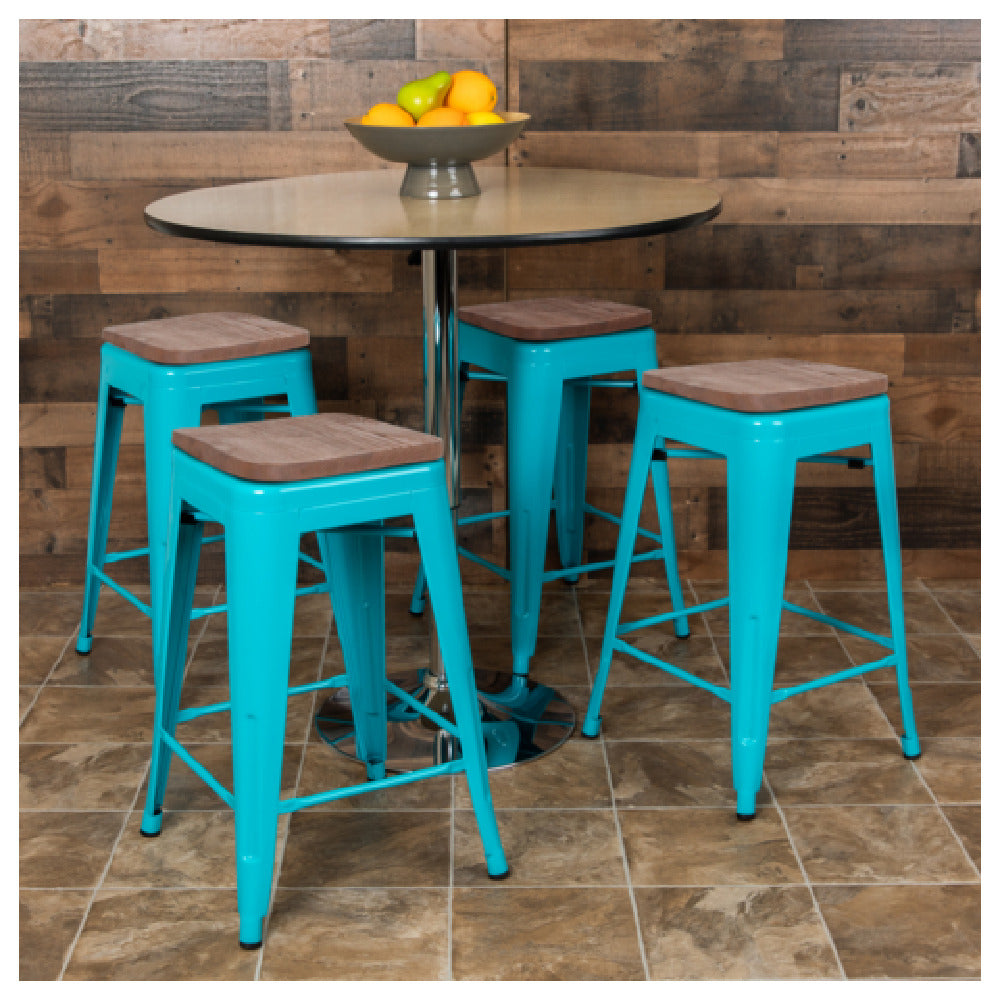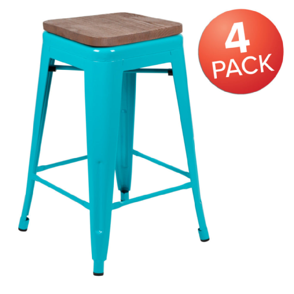 The Flash Furniture 4-ET-31320W-24-TL-R-GG Cierra Indoor Bar Stool is a versatile seating solution designed to meet the demands of various environments. Featuring a robust weight capacity of 440 pounds, this bar stool stands out for its durability and strength, making it suitable for a wide range of users. With dimensions of 16 inches in width, 16 inches in depth, and 24 inches in height, it offers a compact yet comfortable seating option, ideal for both residential and commercial spaces. The stool's stackable design allows for easy storage, saving valuable space when not in use. Constructed with a sturdy metal frame and a wood seat, this bar stool combines industrial appeal with classic elegance. The integrated footrest provides added comfort, making it perfect for extended seating periods. Additionally, protective plastic floor guides safeguard your flooring from scratches and scuffs. Available in a vibrant teal color, this set of 4 stools adds a pop of color to any setting, enhancing the aesthetic of bars, kitchens, and dining areas. The Flash Furniture Cierra Indoor Bar Stool offers a unique blend of style, functionality, and resilience, catering to diverse market segments that prioritize quality and design.