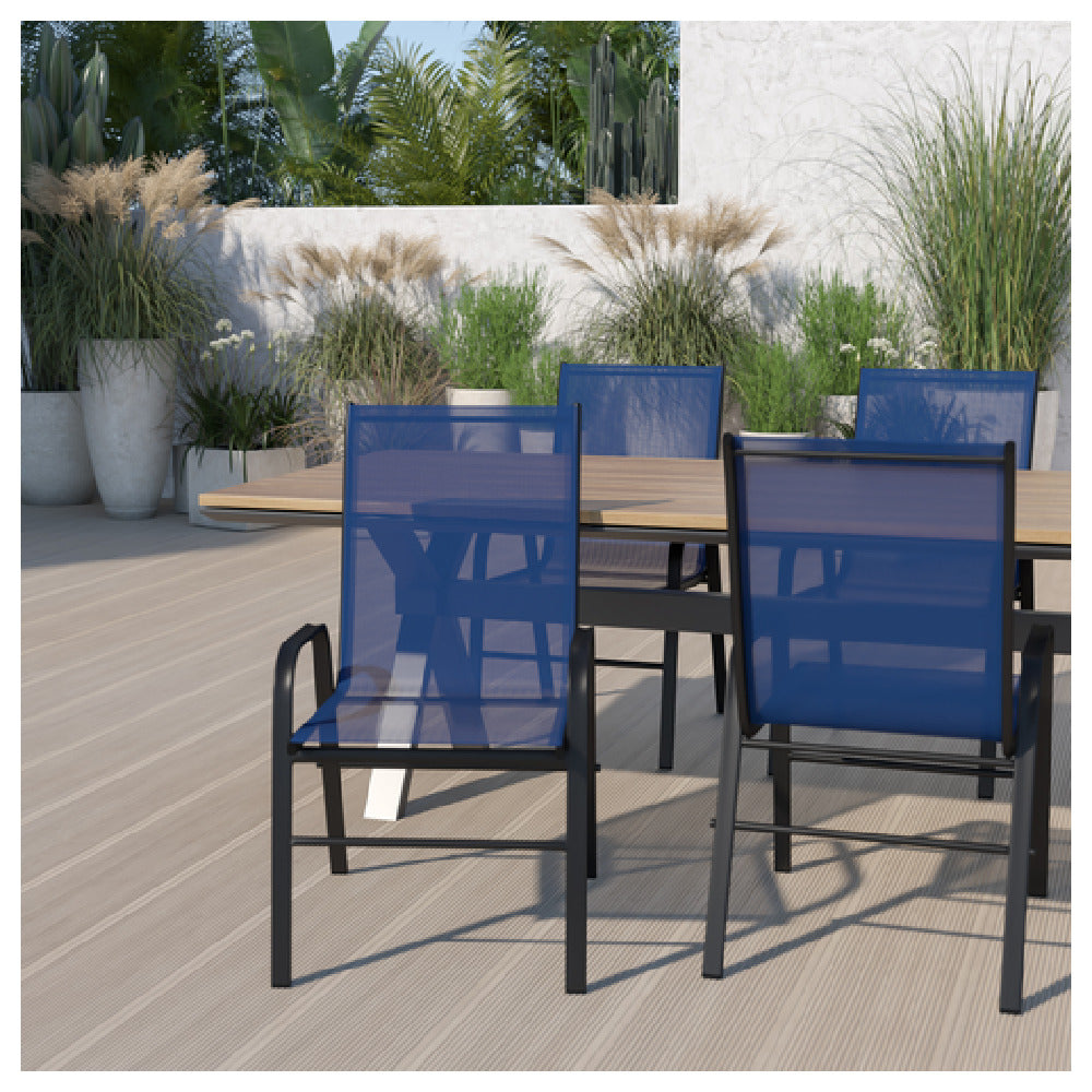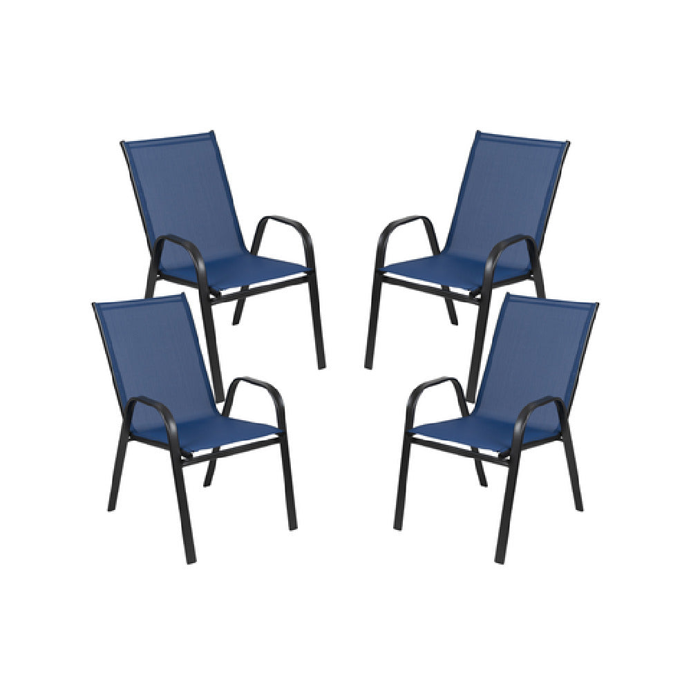 The Flash Furniture 4-JJ-303C-NV-GG Brazos Series Stacking Patio Chair is a robust seating solution with a substantial weight capacity of 350 lbs, making it suitable for a variety of users in both residential and commercial settings. This chair features a stackable design, allowing up to four chairs to be stacked together for efficient storage and space-saving. It is crafted with curved arms for added comfort, and its navy textilene fabric provides both durability and a modern aesthetic. The frame is finished with a black powder-coated coating, ensuring longevity and resistance to outdoor elements. The inclusion of plastic floor glides protects surfaces from scratches and scuffs, enhancing its suitability for diverse environments. Designed explicitly for outdoor use, this chair comes in a convenient set of four and is shipped fully assembled, offering immediate usability. Its availability for quick shipping, usually within 24 hours for in-stock items, makes it an appealing choice for various markets, from hospitality to home patio settings. The Flash Furniture Brazos Series chair combines functionality with style, meeting the demands of high-traffic areas while maintaining a sleek and modern look.