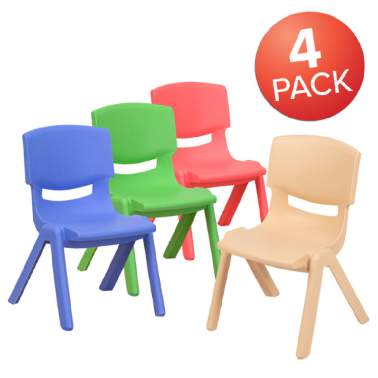The Flash Furniture 4-YU-YCX4-003-MULTI-GG Whitney Stacking Chair is a versatile seating solution specifically designed to meet the needs of preschool environments. With a weight capacity of 154 lbs, each chair provides reliable support for young children. The chair features a 10-1/2 inch seat height, which is ideal for comfortable seating for preschool-aged children. Constructed from durable polypropylene, this chair is built to withstand daily usage while maintaining its vibrant appearance. Available in assorted colors, the set of four chairs adds a cheerful touch to any classroom or play area. One of the standout attributes of this product is its ability to stack up to ten chairs high, allowing for convenient storage and space-saving when not in use. This feature makes it particularly valuable for facilities with limited space or those that require frequent rearrangement of seating. Additionally, the Whitney Stacking Chair requires no assembly, offering immediate utility right out of the box. This pragmatic design makes it an excellent choice for educators and caregivers seeking a hassle-free furniture solution. Its thoughtful engineering and colorful design blend practicality with aesthetic appeal, making it a favored choice in preschool settings.