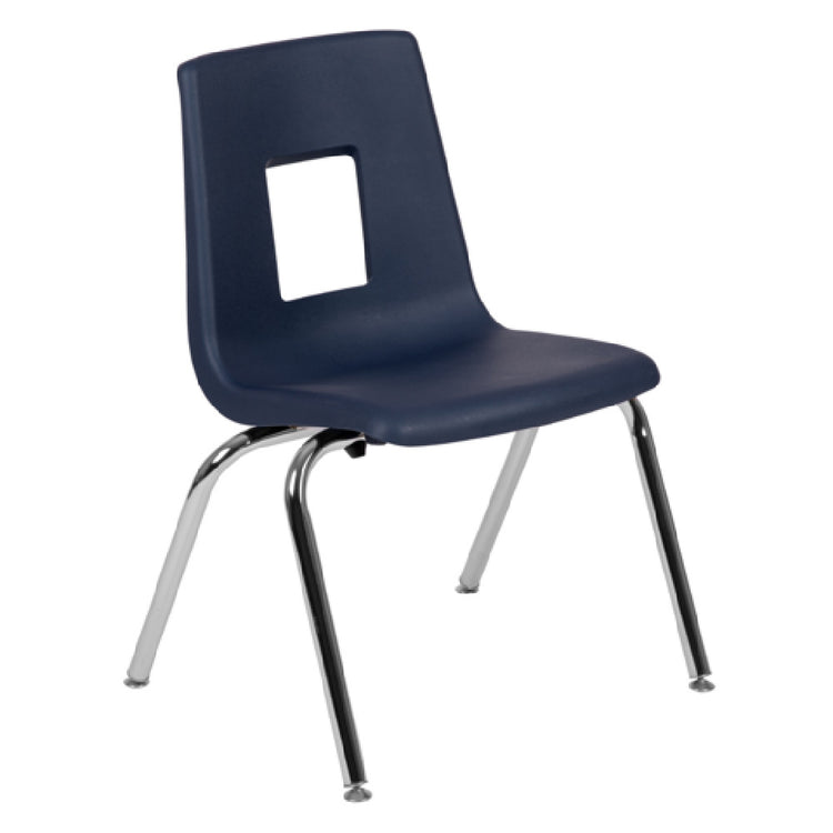 The Flash Furniture ADV-SSC-16NAVY Mickey Advantage Stacking School Chair is specifically engineered to accommodate a weight capacity of 225 lb., making it a robust seating solution ideal for educational environments. This chair is designed with a 16" seat height that is tailored for 3rd-7th grade students, ensuring comfort and ergonomics for this age group. The seat is constructed from durable polypropylene, providing a sturdy and easy-to-clean surface. Complementing the seat, the chair's frame is made from chrome-plated steel, enhancing both its visual appeal and structural integrity. Additionally, the chair is fitted with nylon tipped glides, which help protect floors from scratches and allow for smooth movement. One of the key features of the Mickey Advantage Stacking School Chair is its stackability, with the ability to stack up to 12 chairs, optimizing space in any classroom or multipurpose area. The chair's navy color provides a classic appearance that blends seamlessly into a variety of settings. This product is ideal for educational institutions seeking a practical, space-efficient seating option capable of enduring the everyday wear and tear of a busy school environment.