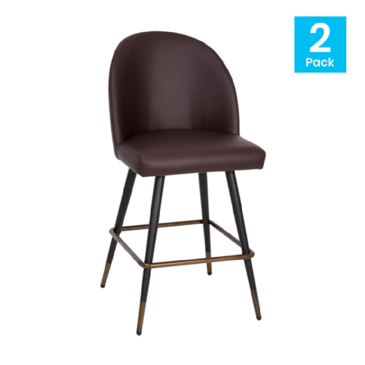The Flash Furniture AY-1026H-26-BR-GG Lyla Counter Stool is a meticulously crafted seating solution designed for diverse environments. With a substantial 300 lb weight capacity, this stool is built to accommodate a wide range of users, ensuring durability and stability. The stool features a 26-inch seat height, making it ideal for use at kitchen islands, bar counters, or high-top tables. A key highlight is its contoured backrest, which enhances ergonomic support and comfort, complemented by the foam-padded back and seat that provide a plush seating experience. Constructed with a powder-coated steel frame, the stool is engineered for long-lasting use, while its protective floor glides safeguard your surfaces from scratches and scuffs. The LeatherSoft upholstery in a rich brown tone offers a sophisticated aesthetic, combining the softness of leather with the durability of polyurethane. Sold as a set of two, these stools require assembly, making them a flexible option for both residential and commercial settings. The blend of technical precision and stylish design underscores the stool's adaptability in various settings, from modern home kitchens to bustling restaurant environments, positioning it as a versatile choice for those seeking both functionality and elegance in their seating arrangements.