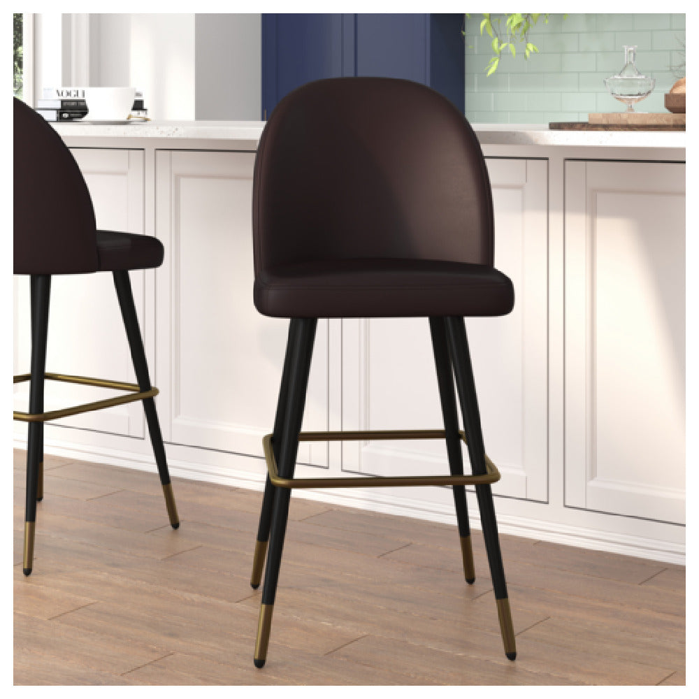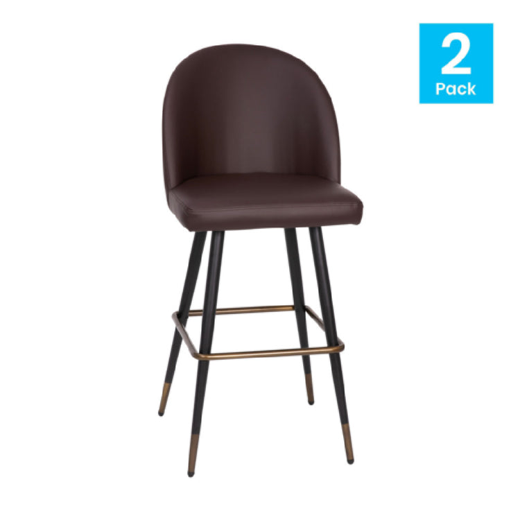 The Flash Furniture AY-1026H-30-BR-GG Lyla Bar Stool is designed to meet the diverse needs of various market segments within the furniture industry. With a 300 lb. weight capacity, it is engineered to provide robust support, making it a suitable option for both commercial and residential settings. Featuring a 30" seat height, this bar stool is ideal for high tables and bar counters. Its armless design and contoured backrest foster a sleek, minimalist aesthetic while ensuring user comfort. The foam-padded back and seat further enhance the seating experience, offering cushioned support for prolonged use. Crafted with a powder-coated steel frame, the bar stool boasts durability and stability, essential for high-traffic environments. Protective floor glides are included, safeguarding various flooring types from potential damage. The stool is upholstered with LeatherSoft, a blend of leather and polyurethane, providing a soft, luxurious feel along with increased durability. The rich brown color adds a touch of elegance, effortlessly complementing a variety of interior decors. Sold as a set of two, assembly is required upon purchase, making this product a practical and stylish addition for any setting seeking quality and functionality in its seating solutions.