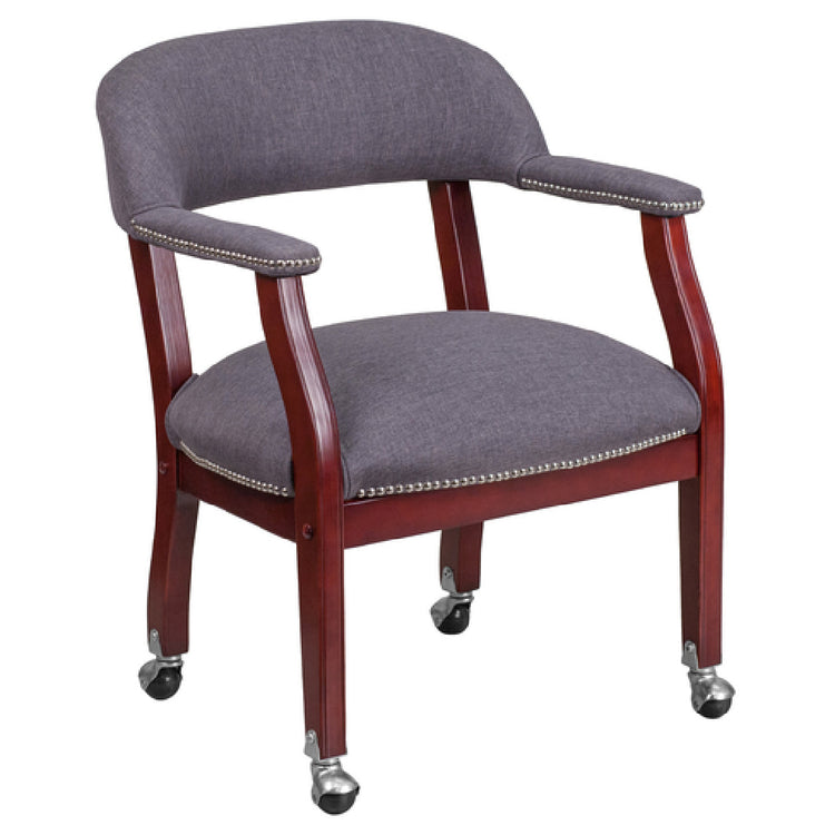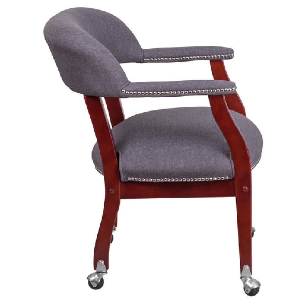 The Flash Furniture B-Z100-GY-GG Luxurious Conference Chair is engineered to deliver comfort and style, with a sturdy 250 lb. weight capacity. Featuring a sophisticated open back design, this chair ensures breathability and modern aesthetics. Its contoured cushions are upholstered with durable polyester, providing long-lasting comfort for extended meetings. The chair's elegant silver nailhead trimming adds a touch of sophistication, coordinating with its upholstered straight arms, which are accented by silver nail details. The CA117 fire retardant foam ensures safety and compliance with stringent fire standards, making it suitable for professional environments. Built upon a solid hardwood mahogany frame, this chair promises dependable support and durability. The silver hooded ball casters facilitate easy mobility, allowing this chair to glide smoothly over most surfaces. Presented in a versatile gray color, the chair requires assembly upon receipt. Ideal for executive conference rooms, boardrooms, or high-end office settings, this chair combines aesthetic appeal with functional design, providing a seating solution that caters to various professional needs. Items typically ship within 24 hours, ensuring prompt delivery for your business requirements.