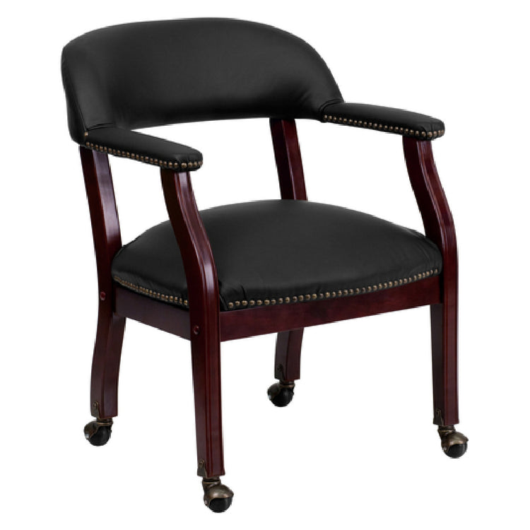 The Flash Furniture B-Z100-LF-0005-BK-LEA-GG Conference Chair - 250 lb. Weight Capacity is a meticulously designed seating solution that combines style and functionality for various professional environments. This chair features an open back design and contoured cushions that provide ergonomic support for extended seating comfort. The top grain Italian leather upholstery offers a touch of luxury, enhanced by elegant brass nailhead trimming that adds a classic aesthetic. The upholstered straight arms with brass nail accents further contribute to the chair's sophisticated appeal. Constructed with a solid hardwood mahogany frame, this chair assures durability and sturdiness, supporting up to 250 lbs. It is equipped with brass hooded ball casters, ensuring smooth mobility across office floors. The chair includes CA117 fire retardant foam, emphasizing safety in commercial spaces. This chair, available in black, requires assembly upon delivery. Suitable for conference rooms, executive offices, and professional settings, it combines aesthetic elegance with practical design features. The Flash Furniture B-Z100-LF-0005-BK-LEA-GG Conference Chair is in stock and typically ships within 24 hours, making it a reliable option for businesses seeking prompt furniture solutions without compromising on quality or style.